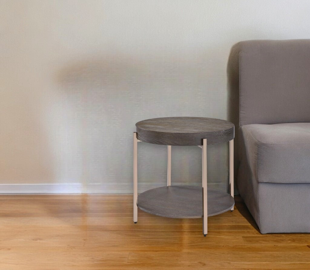23" Champagne Metal And Dark Oak Manufactured Wood Round Two Tier End Table