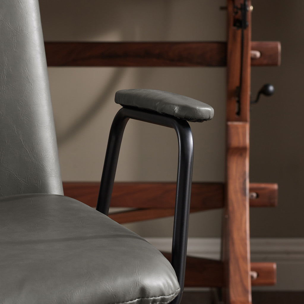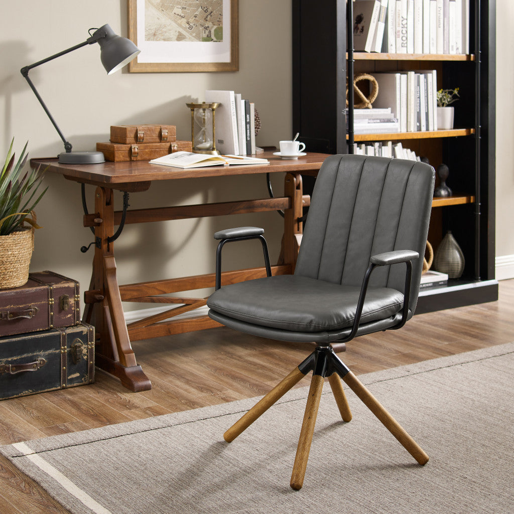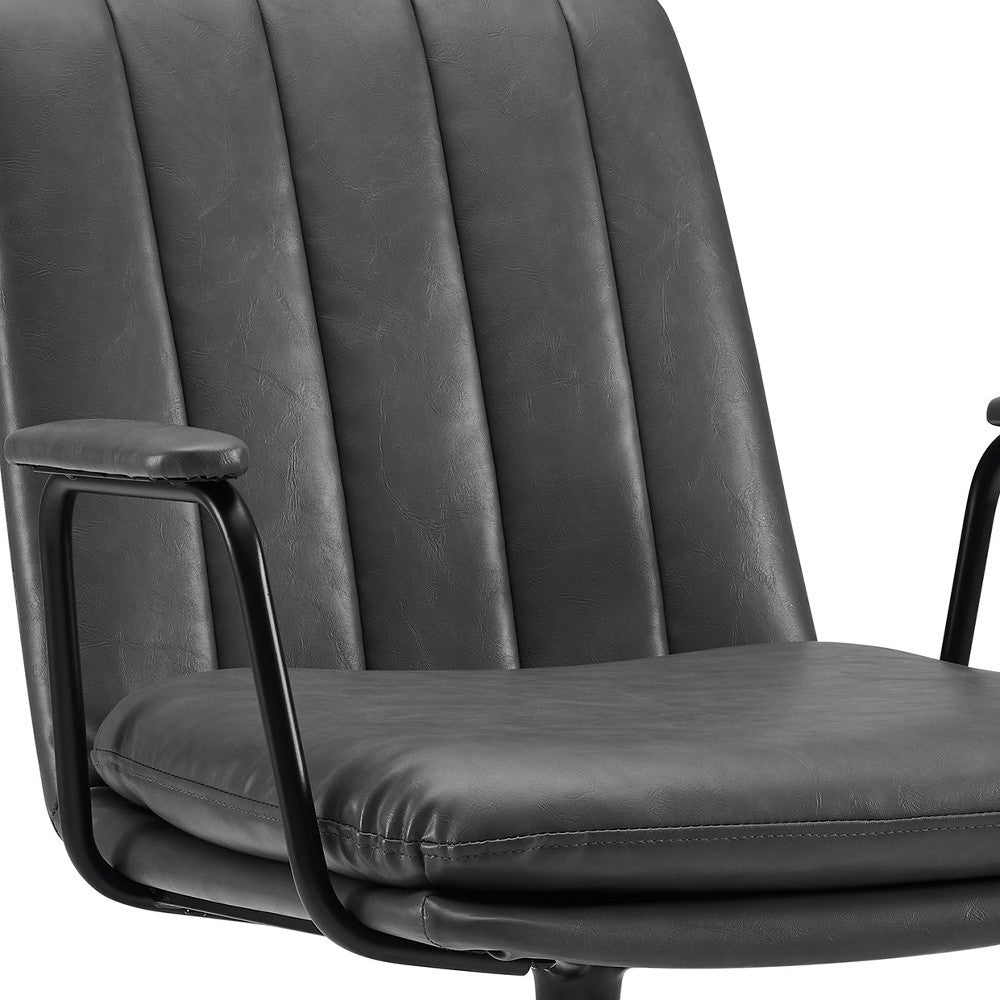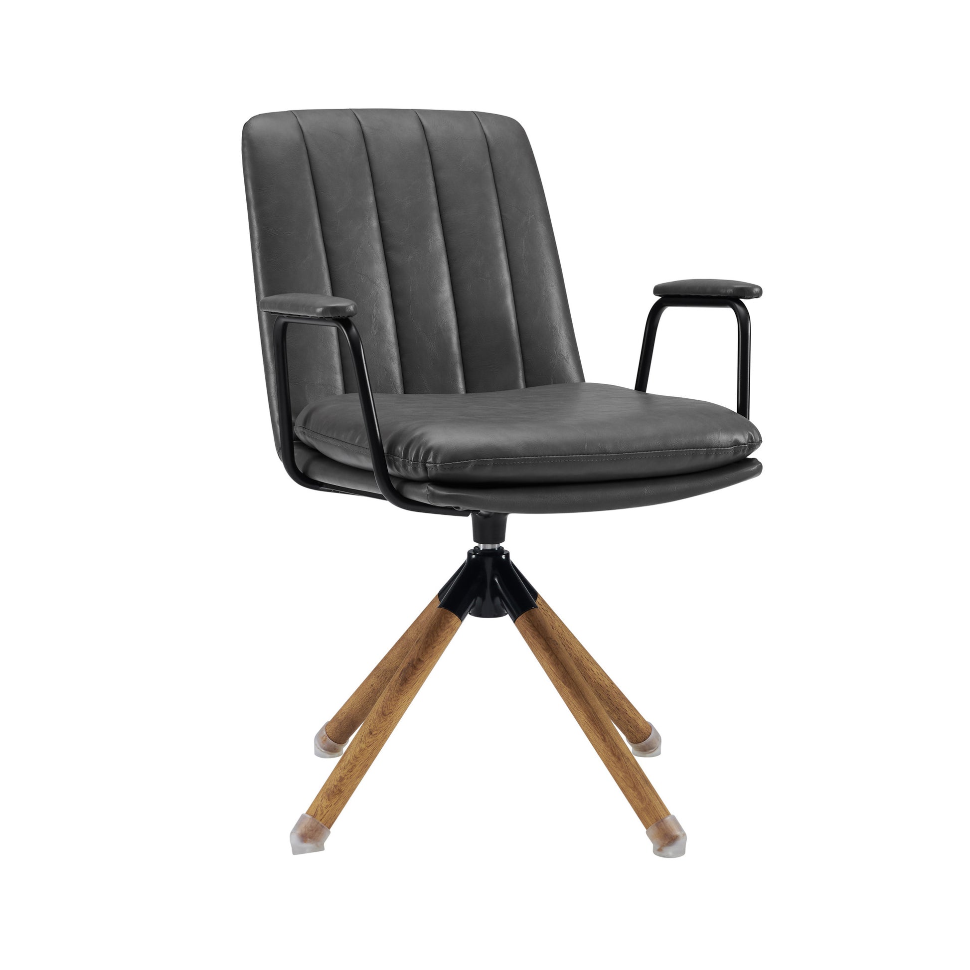 This 23-inch charcoal and natural faux leather swivel arm chair will add a beautiful decorative accent to your decor. This gorgeous solid color charcoal arm chair is masterfully upholstered in durable faux leather. Giving the chair stability and structure, the inner frame is constructed with high quality solid wood, includes comfy armrests, and features a fixed back that comes complete with soft and comfortable cushioning. A swivel feature allows this chair to turn, adding versatility to your seating. 34.06-inch H x 23.3-inch W x 25.1-inch D