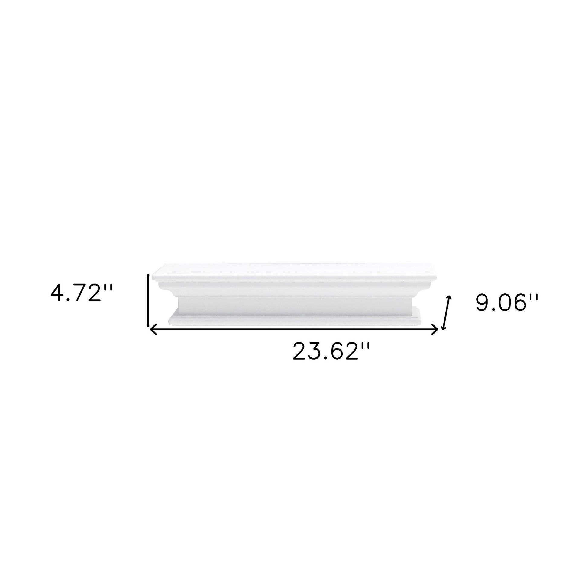 Spruce up your home with the Classic White Medium Floating Wall Shelf, a simple design of sheer elegance and sophistication with the ability to elevate your living area or kitchen space. Crafted from mahogany wood and MDF, the all white semi glossy piece makes a statement while also serving as a storage space for your favorite frames, books or dinnerware. This clean-cut uncomplicated design has a crown molding on top creating a sense of depth. Bunch a few of them evenly on your wall for a refined look or scatter them out in different sizes for a more asymmetrical style. 4.72" x 23.62" x 9.06"