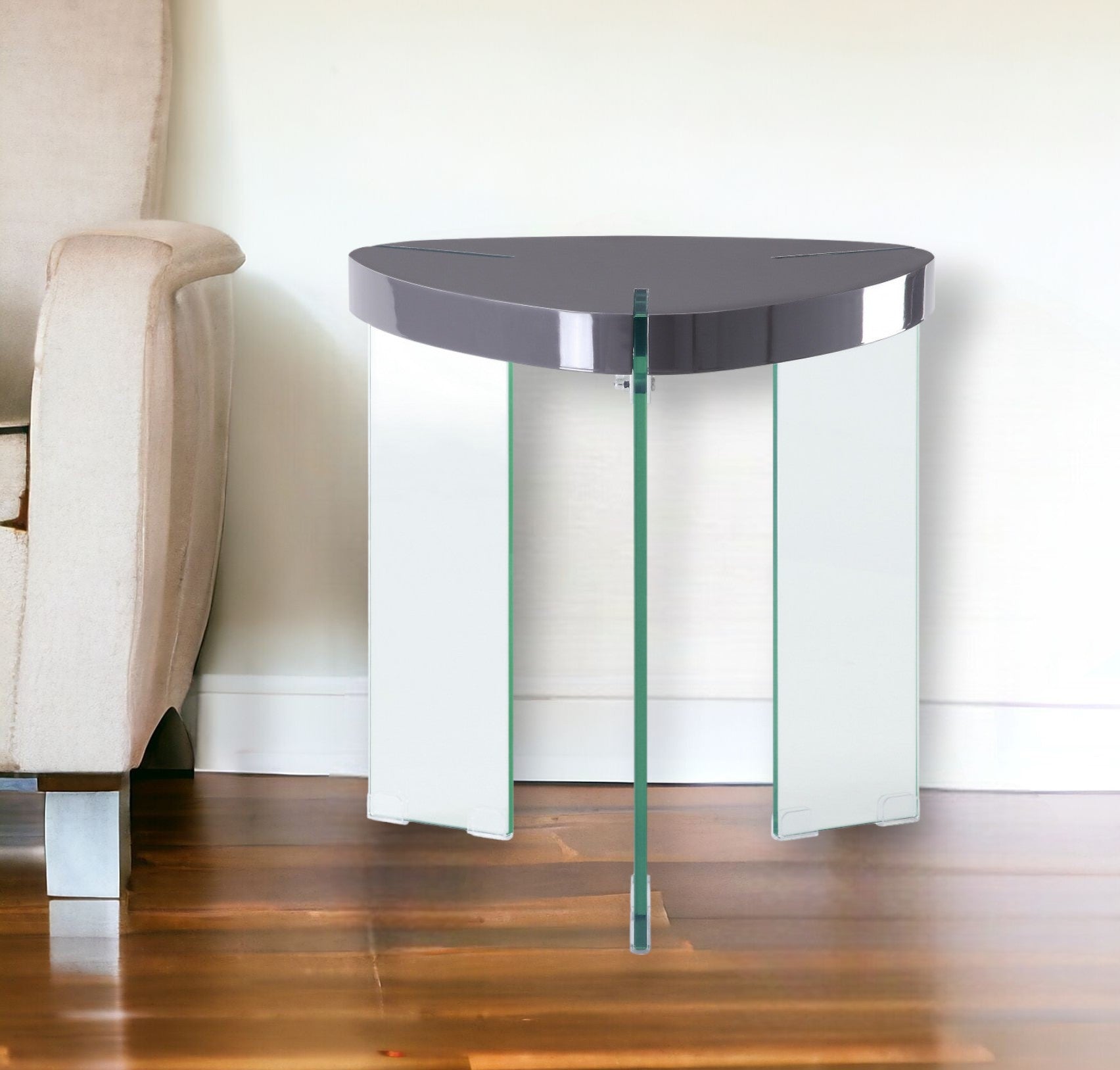 Show off your exquisite taste with this 23" clear and gray manufactured wood and glass triangular end table. The clear coloration of the high quality glass base marries nicely with the gray high gloss manufactured wood top. A great accent on either side of the sofa or bed, this adorable end or side table is just what you need. You can also use it as an entryway table to hold your keys. 23" H x 22" W x 22" D