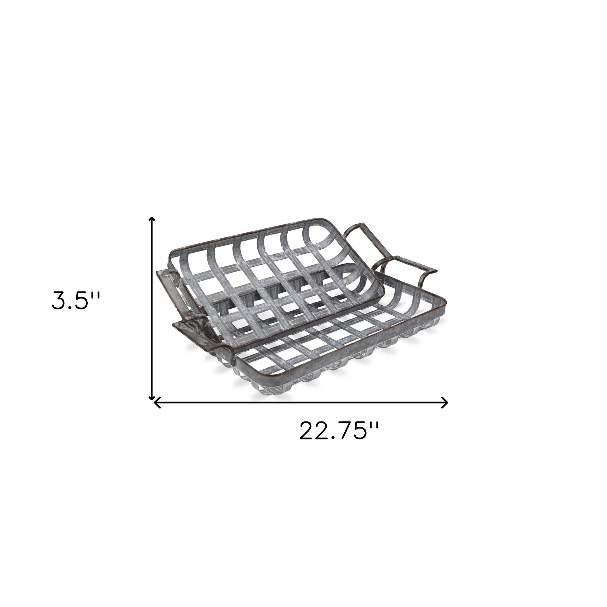 Freshen up your space with this convenient and good looking 23" gray rectangular metal handmade tray with handles! Crafted from sturdy and durable metal, this rectangular tray is versatile enough to blend with a variety of color palettes and aesthetics. Designed with handles for easy transport and convenience. Food safe and versatile, this tray is sure to please. 3.5" H x 22.75" W x 11.75" D