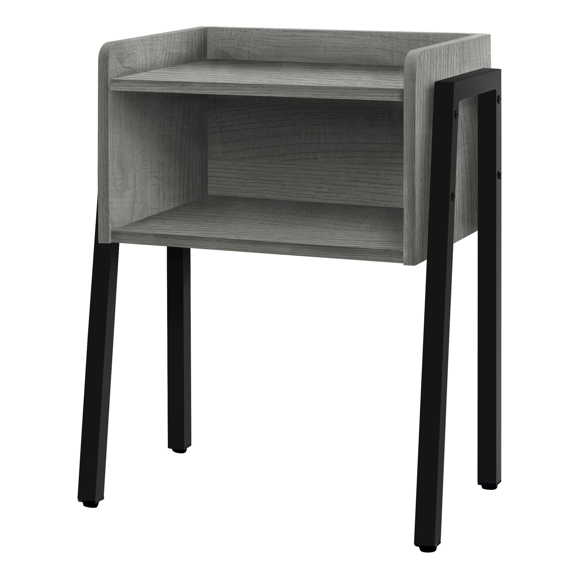 Save space while providing the perfect sidekick to any furniture ensemble. This end table, featuring a reclaimed wood look finish in grey, is equipped with an open shelf and modern black metal legs to complete the industrial-inspired design. Made for showing off your favorite decor items or storing books in the living room or family room, this side table can also be used as a bedside table. It is an on-trend piece that is waiting to be added to any living space. Assembly is required.