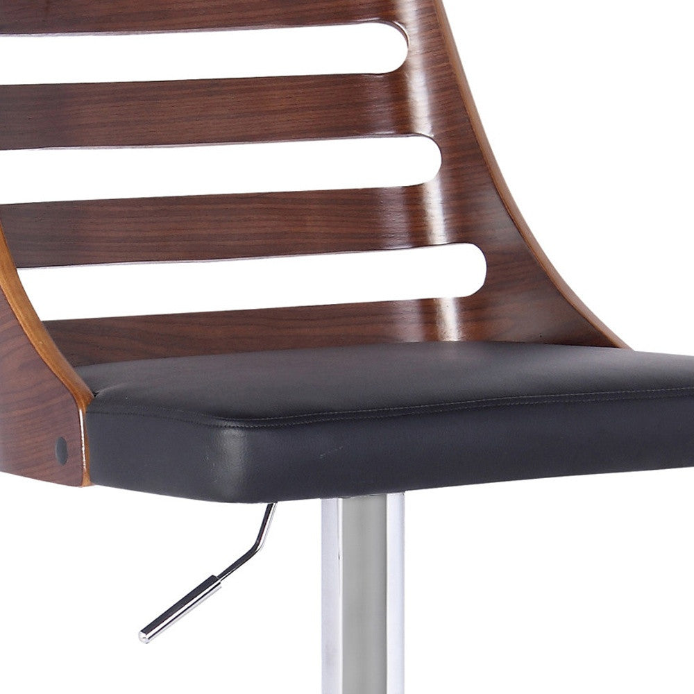 Bring a trendy bar vibe to your space, with this 43" black faux leather and iron adjustable height bar chair. The chrome and walnut coloration of the high quality iron base marries nicely with the black faux leather seat. A full back mixed with a round shaped seat design makes this chair both comfortable and fashionable. A great seating option, this stool will bring a unique look to any room. 43" H x 18" W x 19" D