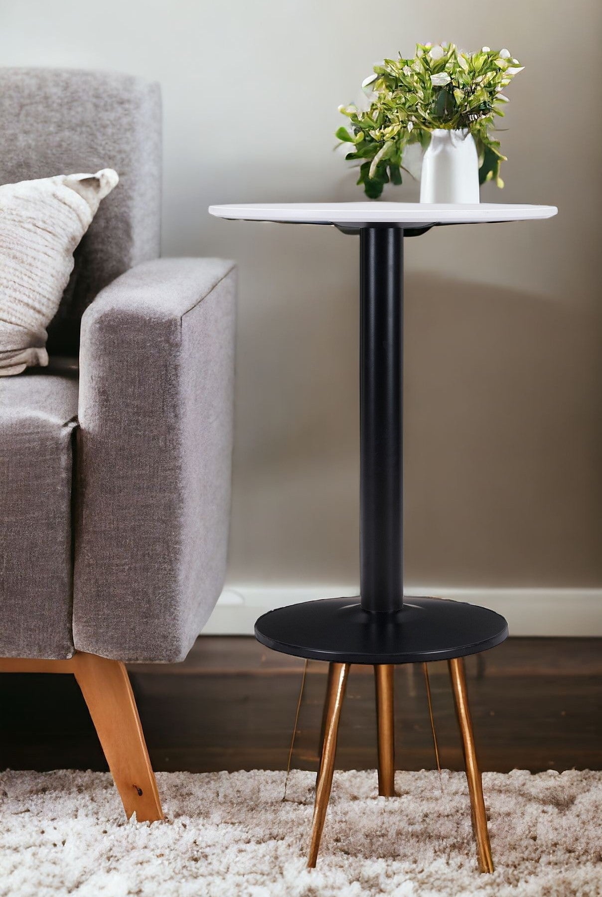 An ideal location for placing your snacks and drinks, this Black and White Round End Table will make a bold and unique statement in your kitchen, lounge area, office or living room. The stylish white veneer tabletop centers on a solid base and pedestal finished in black giving it a contemporary contrast that will look great in your space. This versatile round bistro style table is a great for entertaining or intimate dining. It is a great space-saving option for small dining rooms eat-in kitchens or lounge areas. 29.5" H x 23.6" W x 23.6" D