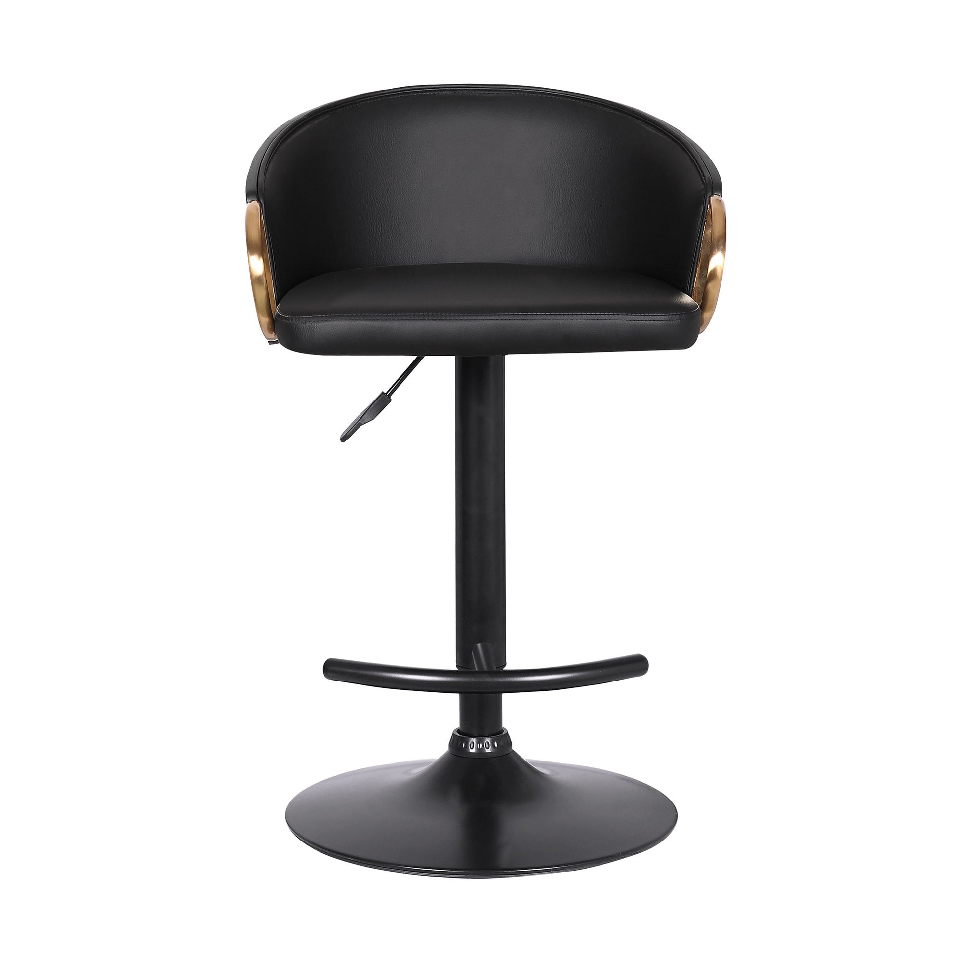This 24-inch black faux leather and iron swivel low back adjustable height bar chair with footrest will be the perfect way to add some cool design and utility to your space similar to what you find in your favorite cafes or pubs. A sleek black monotone color gives this iron and faux leather stool a fresh and updated look. Not only good looking and stylish, this chair features a round shaped seat and a low back for the ultimate in comfort and enjoyment. Designed with armrests for your comfort, this chair also features a footrest for comfort and convenience. 40-inch H x 21-inch W x 19-inch D