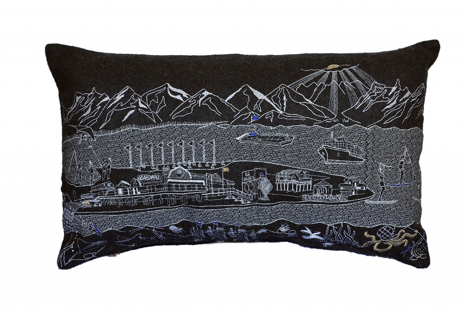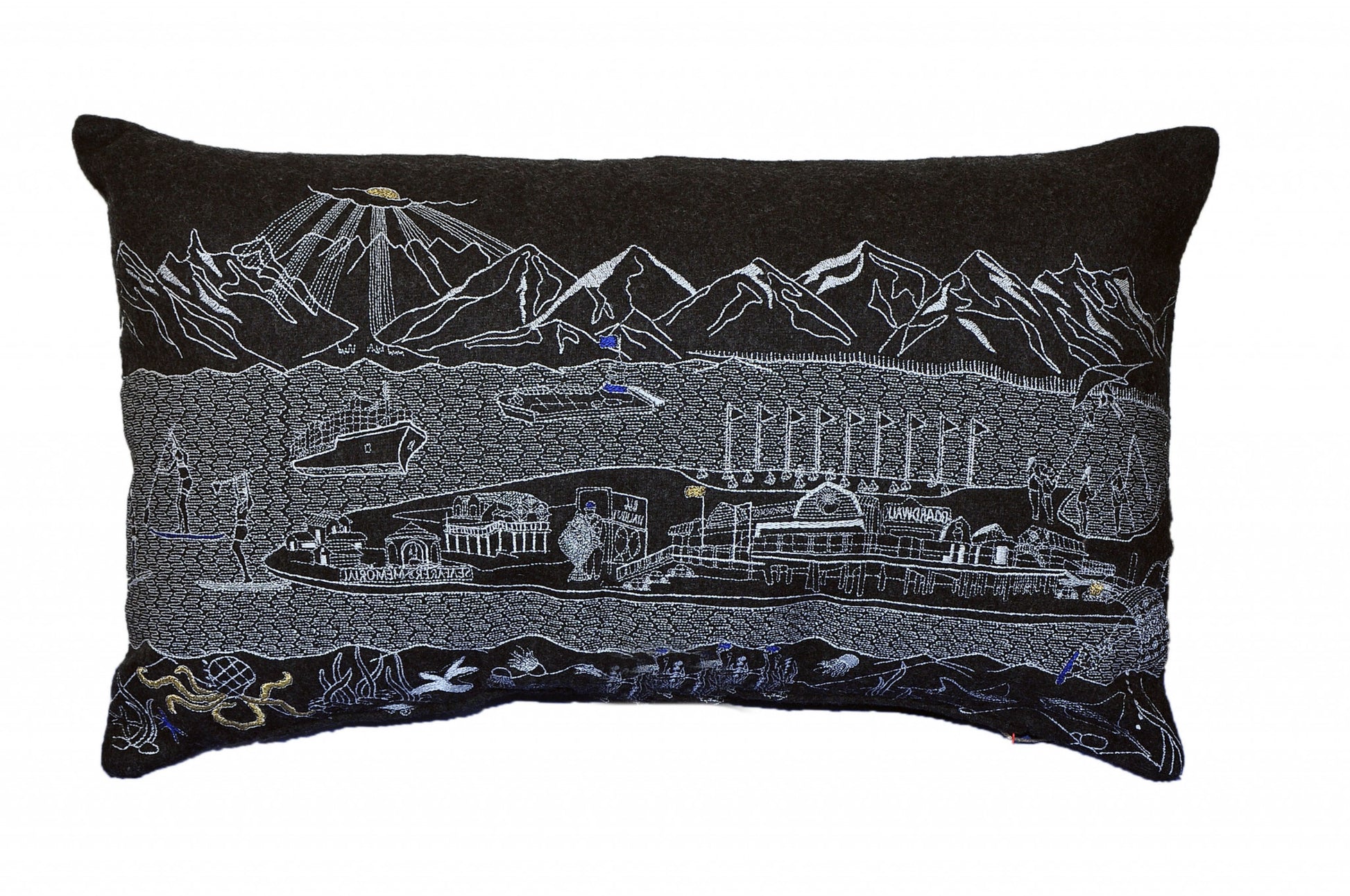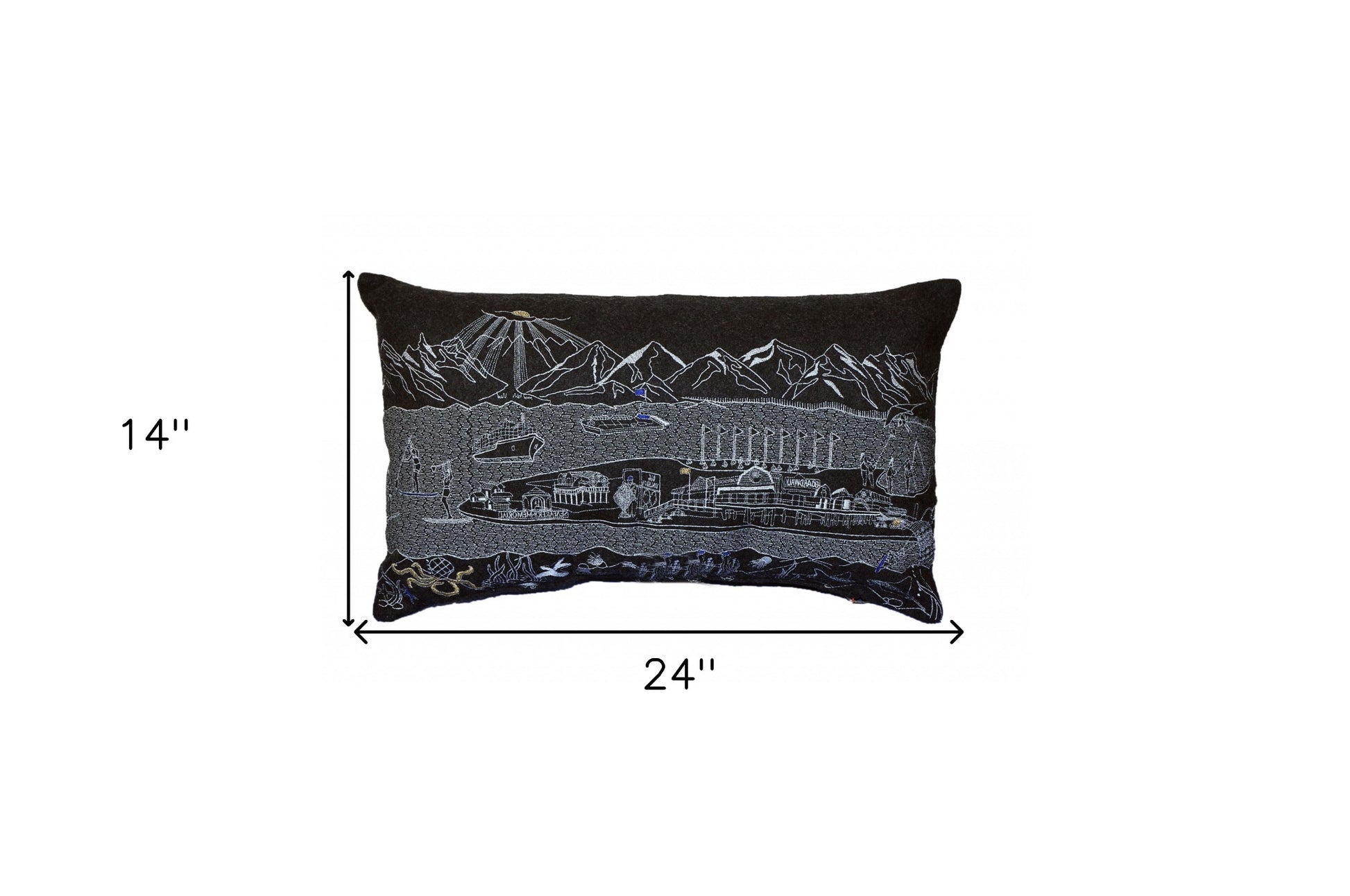 Showcase this famous city, with our Black Color Homer Spit Nighttime Skyline Prince Size Lumbar Decorative Pillow. The Nighttime view of Homer Spit is picture perfect. The gorgeous art features many famous landmarks and references for this destination city, rendering a modern whimsical way to bring this iconic city to life. Made of a wool/nylon blend, this high quality stitched decorative pillow features white on black embroidered artwork mixed with pops of color that highlight important and recognizable icons from this popular Michigan city. This pillow makes a great gift, decorative accent and conversation piece. 4" x 24" x 14"