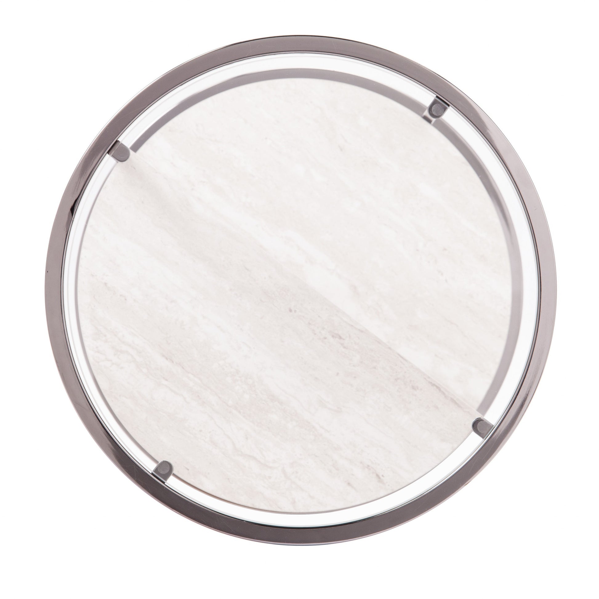 Distinctive in style, the 24" black metal, glass and faux travertine marble round end table with two shelves radiates a versatile charm. This multi-functional end or side table is built to last and is super unique with geometric designs. The black coloration looks cool with the clear glass and marble like half moon shelves. Includes two shelves for additional storage or display space. A great accent on either side of the sofa or bed, this adorable end or side table is just what you need. You can match it with other pieces to get the ideal look for your place. 24" H x 17" W x 17" D