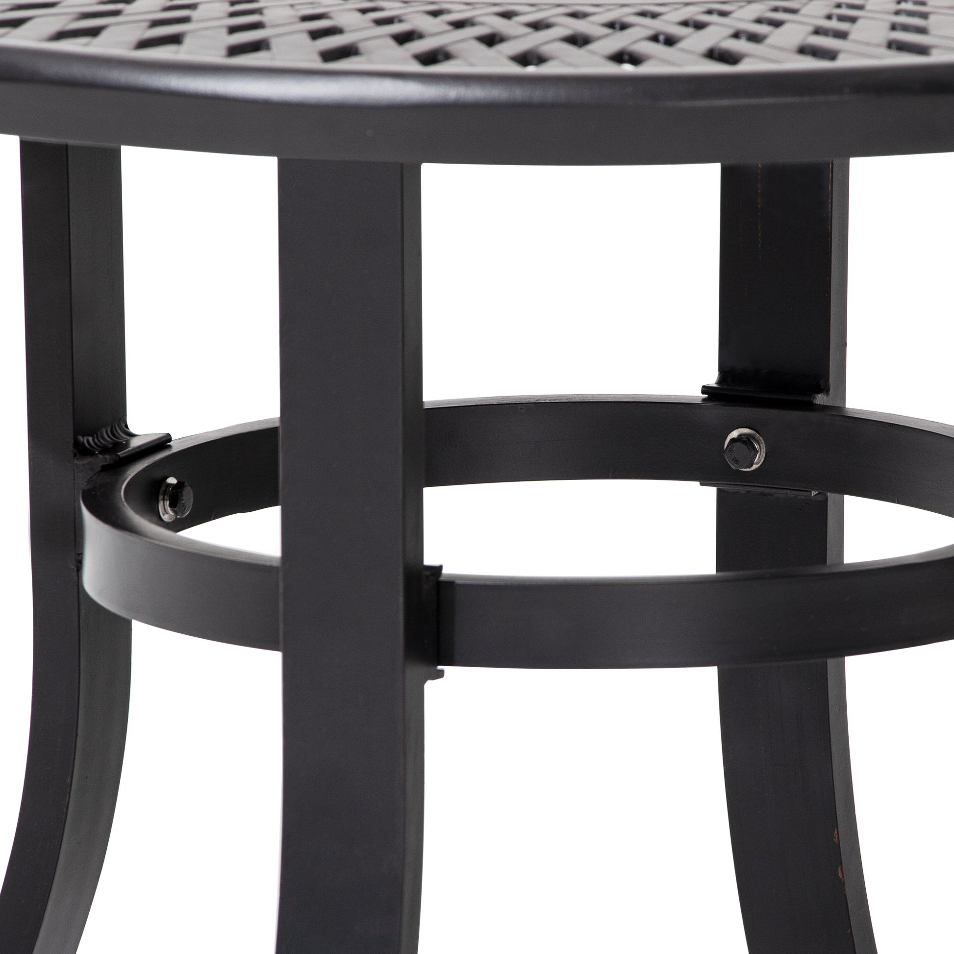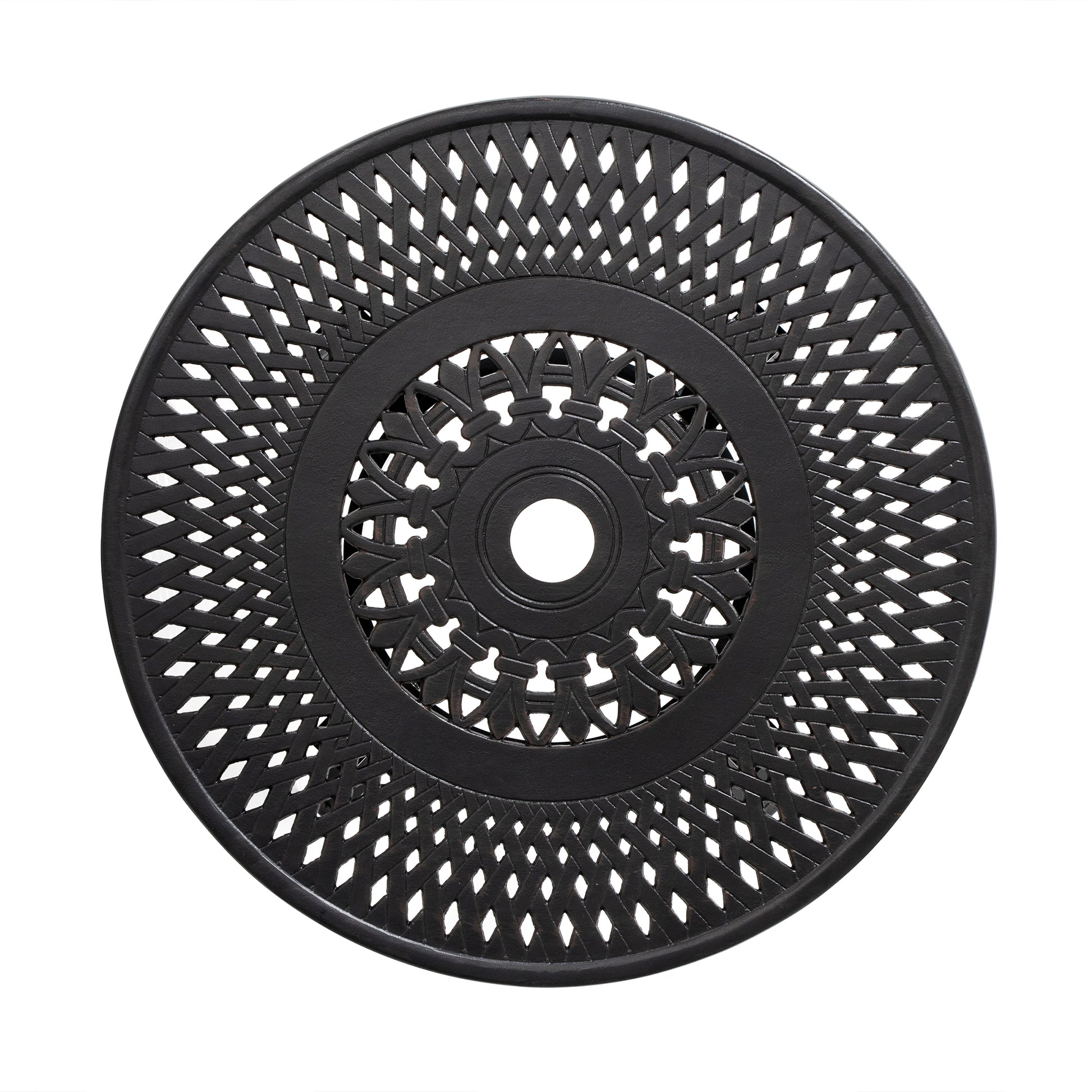 Upgrade your outdoor space with our versatile and stylish 24 inches black rounded metal outdoor bistro table with umbrella hole. Our outdoor bistro table is versatile and can be used for a variety of purposes, such as enjoying a cup of coffee in the morning, sharing a meal with a friend, or playing a game of cards. This black metal tabletop is perfect for an outdoor meal. You can place hot dishes of your favorite food right on the tabletop without worrying about damage. With this round you can get the length of a rectangular table without the harsh corners and you get a little more floor space back. On hot, sunny days, an umbrella can offer much-needed relief from the sun's intense rays, making outdoor dining or relaxation much more comfortable and enjoyable. Don't miss out on this must-have outdoor accessory!. 17.52 inches H x 24.02 inches W x 24.02 inches D