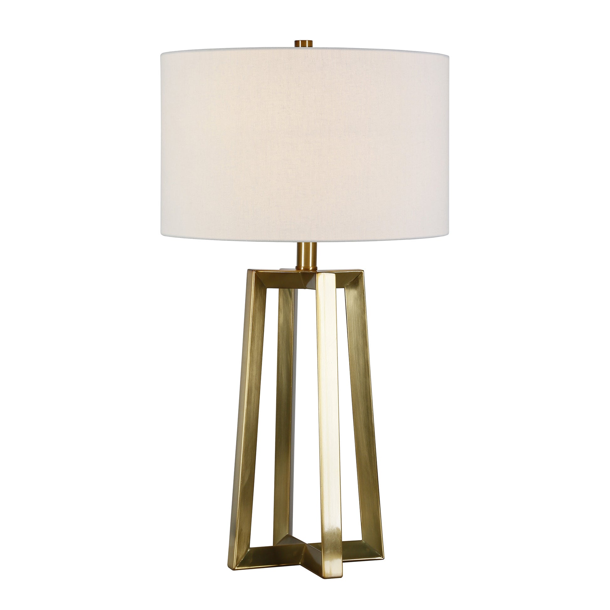 This 24-inch brass metal table lamp with white drum shade is the perfect combination of design and function. The base of this lamp is made of metal finished in a brass tone. Includes a white fabric, drum shaped shade, making this a fashionable piece that will complement most any interior. This standard table lamp is designed to provide general lighting to the area. High quality design makes this a great lamp for not only lighting, but accenting a room with style. The perfect lamp to create just the right natural and soothing light in your space. 24-inch H x 14-inch W x 14-inch D