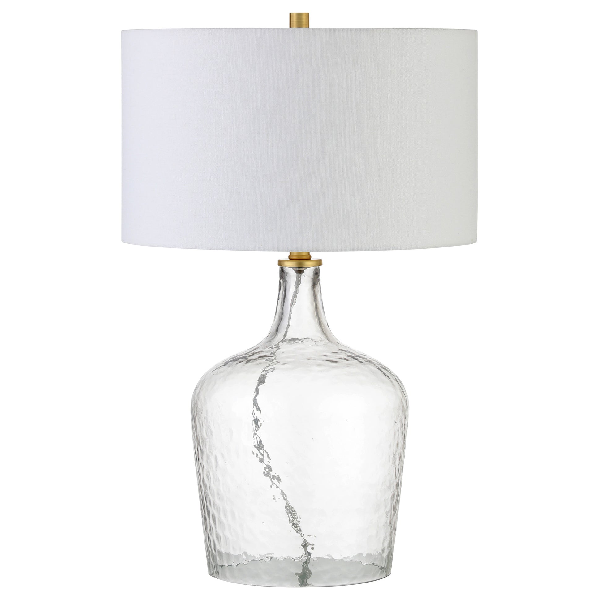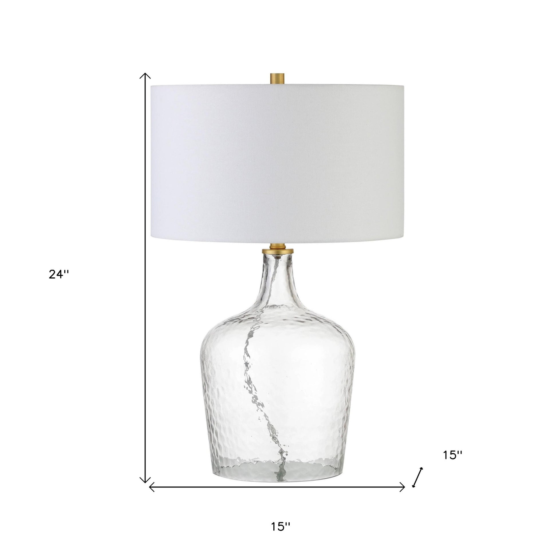 Add a bright anchor to your room with this 24-inch clear glass table lamp with white drum shade. The lamp is made of sturdy glass and features a clear color. The white drum fabric shade is a great compliment to this lamp. This standard table lamp is designed to provide general lighting to the area. The light that this lamp throws is soft and warm to elevate the look of most any space in your home. It is perfect for virtually any decor. 24-inch H x 15-inch W x 15-inch D