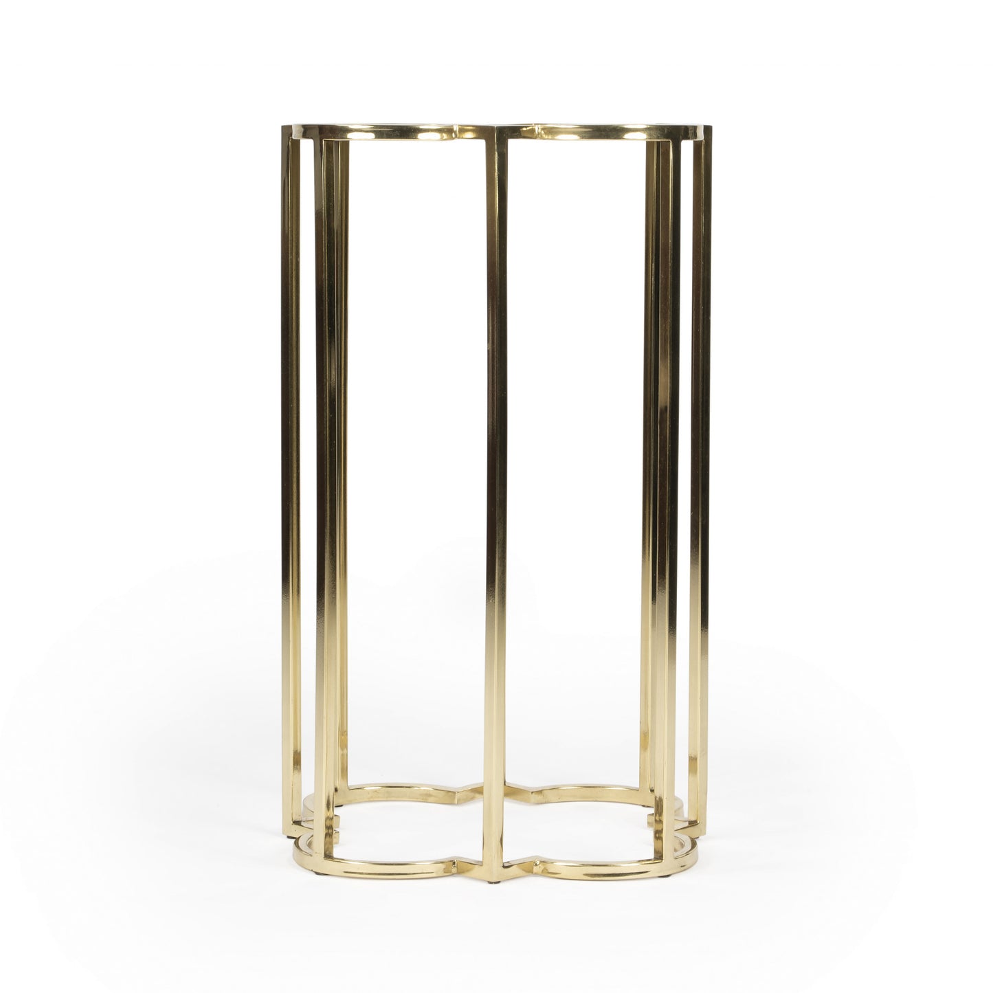 Show off your exquisite taste with this 24" gold and black glass free form end table. The base of this table is made from stainless steel in a gold color that is a nice contrast to the black glass tabletop. Complete with a purposefully distressed finish, this table has an aged, vintage, and rustic feel. Side tables are a great way to flank your sofa, use as an accent next to your favorite chair, or can even be used bedside. You can also use it as an entryway table to hold your keys. 23.5" H x 15.75" W x 15.75" D