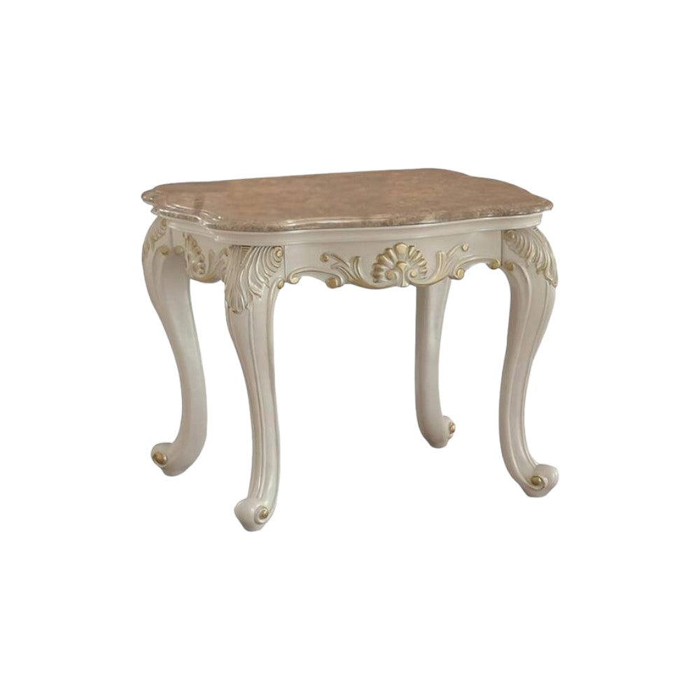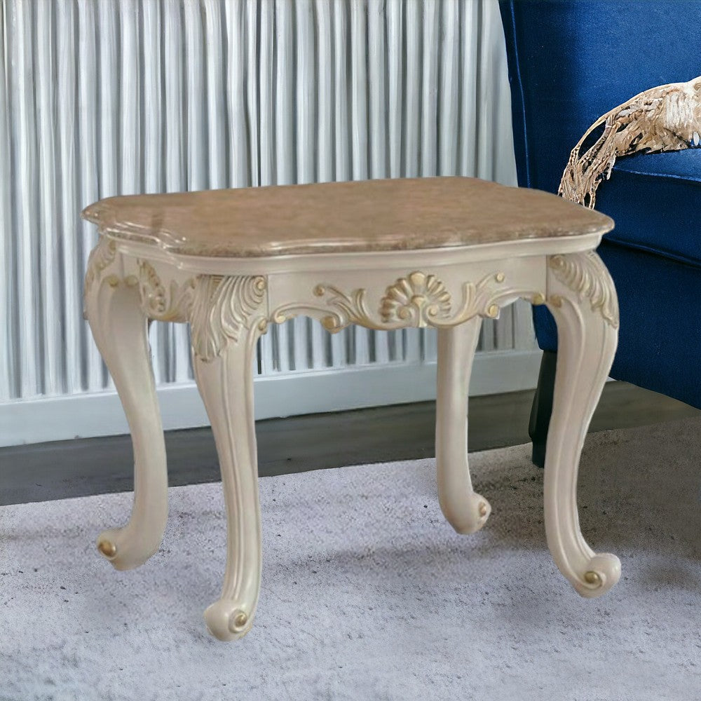 Optimize your space and add some charm to your room with the 24" pearl white brushed with gold accents and light brown marble end table. The base of this table is made from manufactured wood in a pearl white brushed with gold accents color that is a nice contrast to the light brown marble tabletop. Side tables are a great way to flank your sofa, use as an accent next to your favorite chair, or can even be used bedside. You can match it with other pieces to get the ideal look for your place. 24" H x 26" W x 28" D