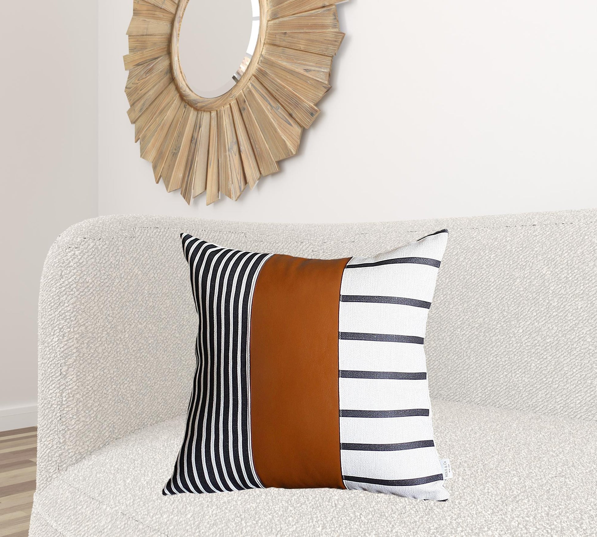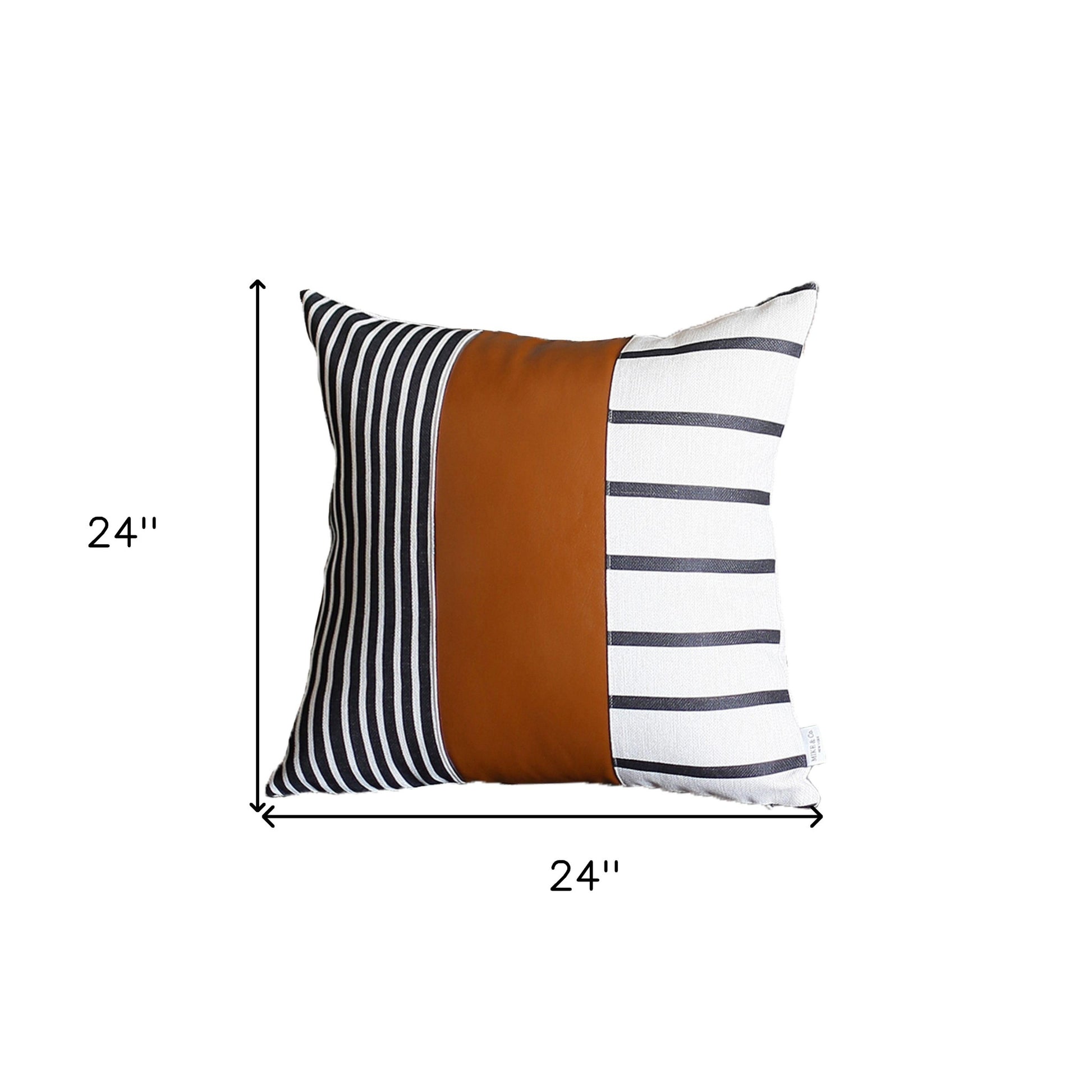 24" X 24" Brown and White Faux Leather Striped Zippered Pillow Cover