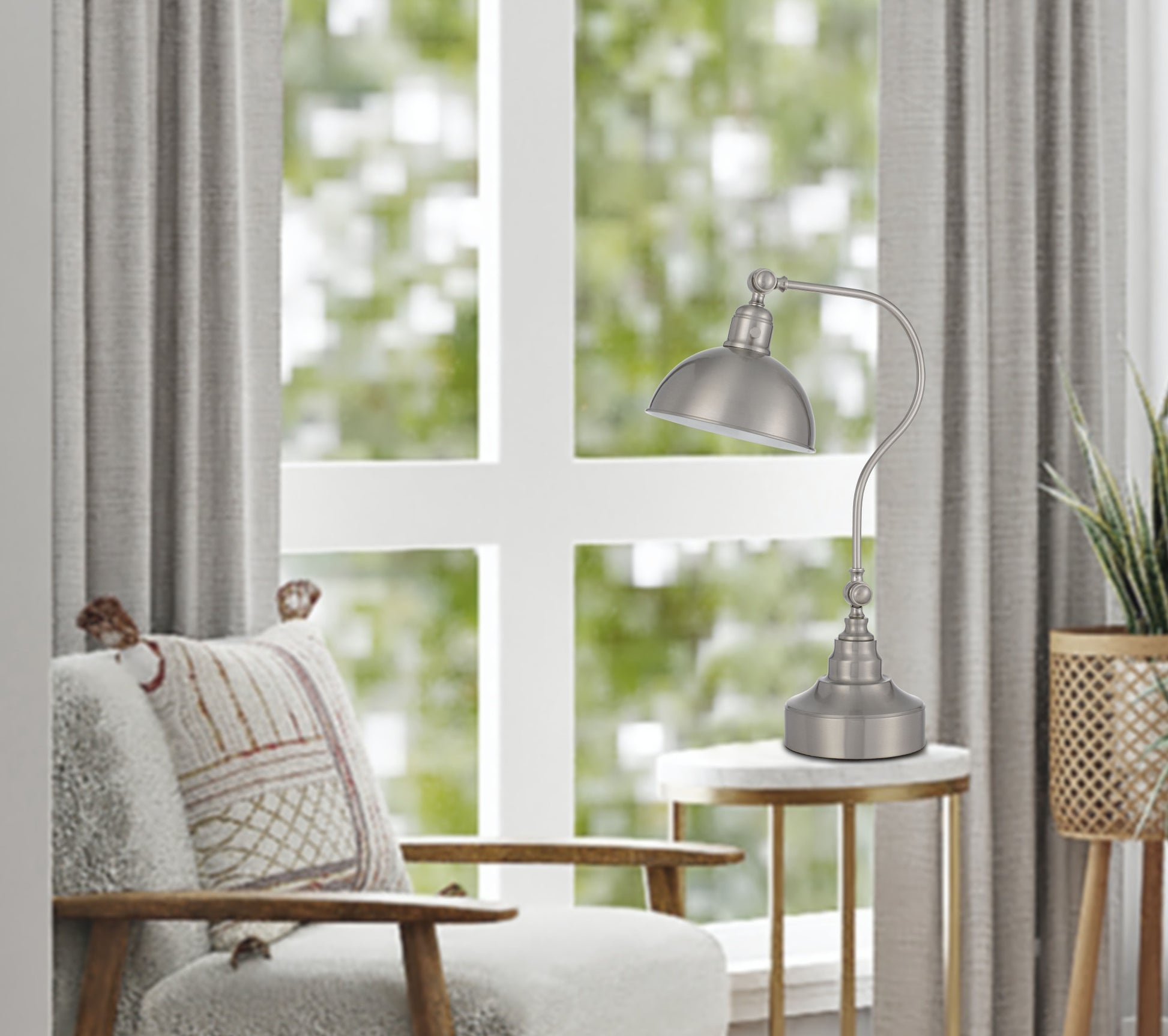 This 25" nickel metal desk table lamp with nickel dome shade is the perfect combination of design and function. The lamp is made of sturdy metaland features a nickel color. The nickel dome metal shade is finishes this piece off nicely and symmetrically This desk lamp provides 'task lighting' that will illuminate your working area for reading or writing. The light that this lamp throws is soft and warm to elevate the look of most any space in your home. The perfect lamp to create just the right natural and soothing light in your space. 25" H x 9" W x 18" D