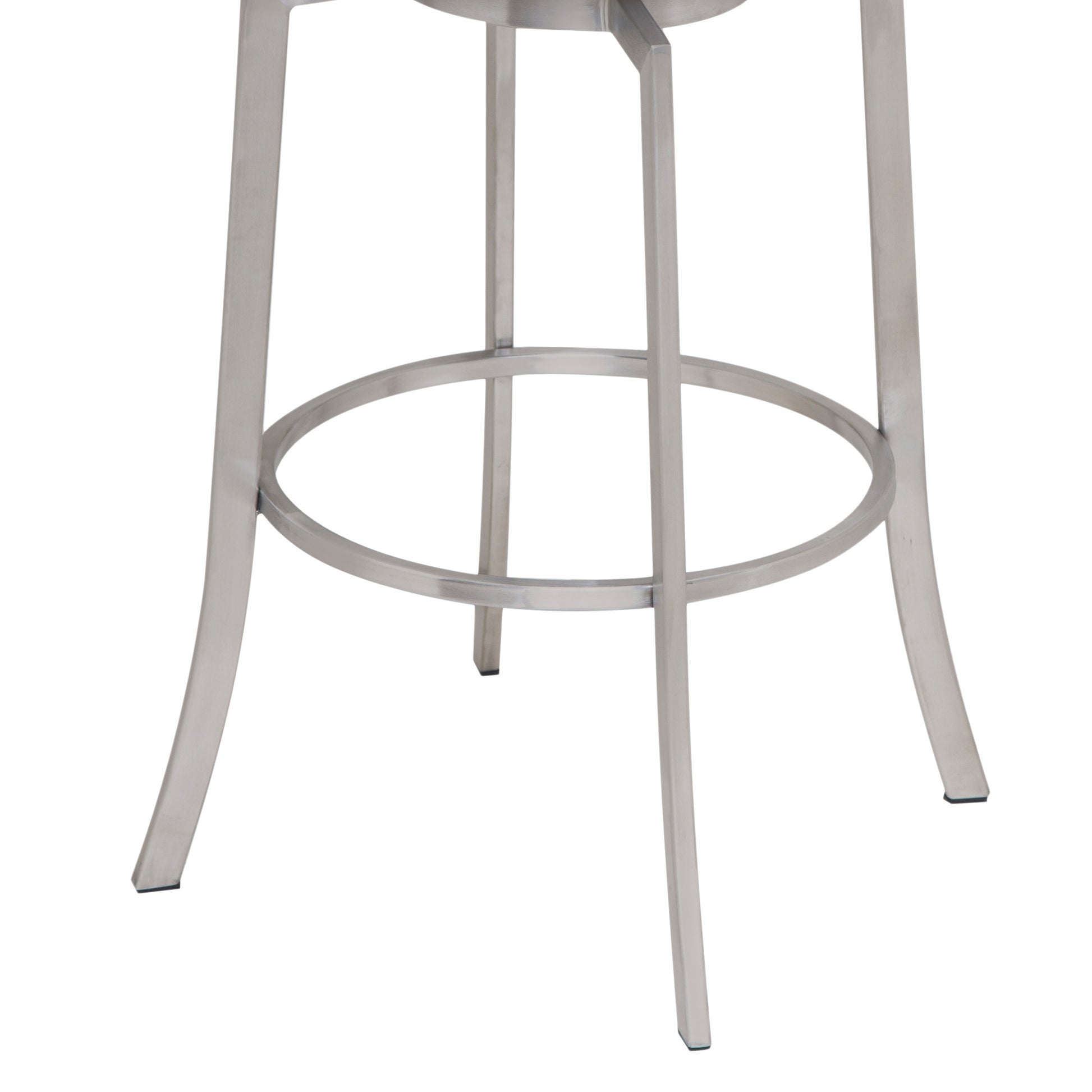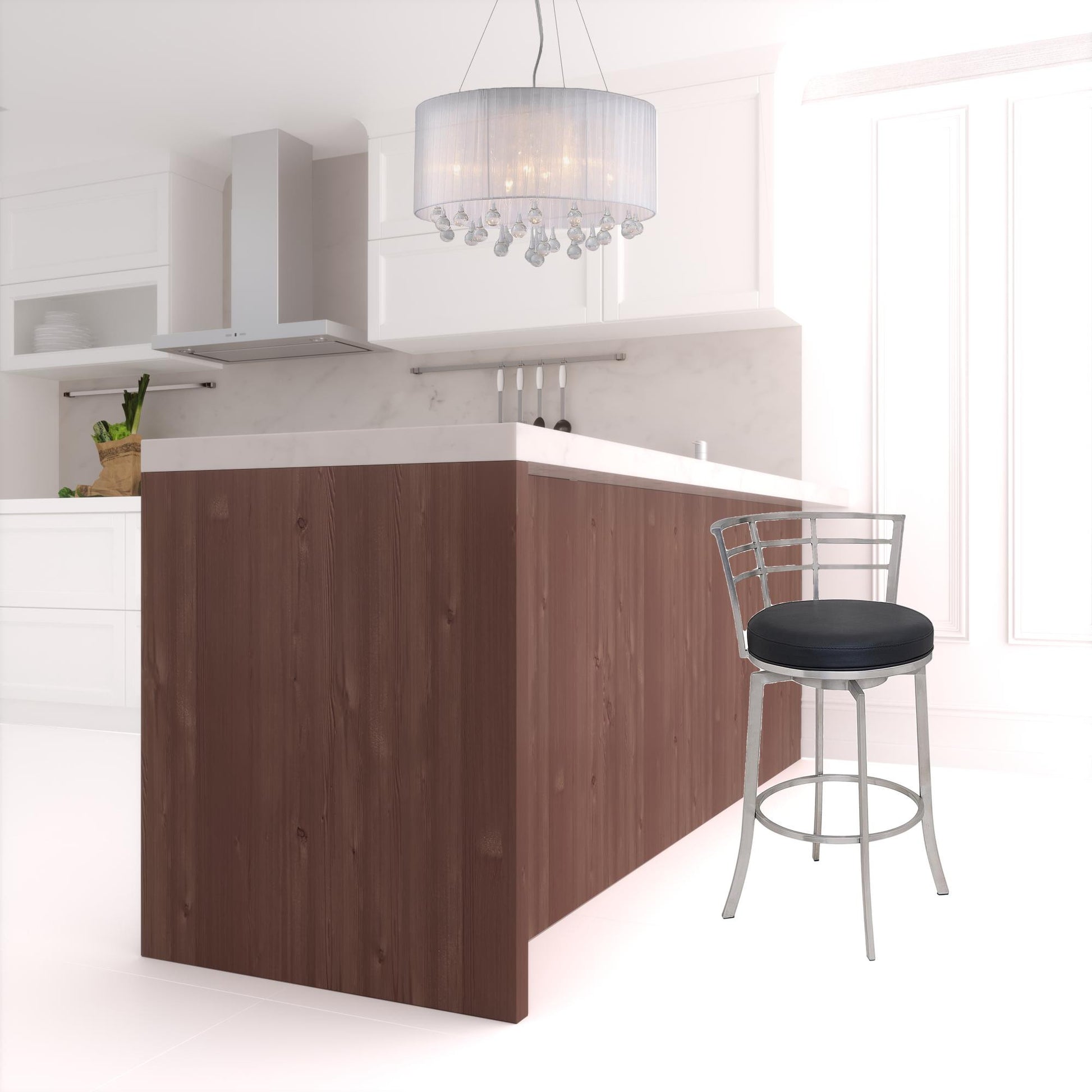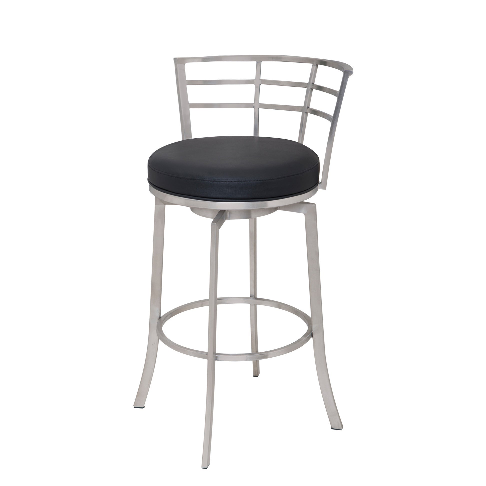 Comfortable enough to sit in for awhile, this 35" black faux leather and iron swivel low back counter height bar chair will transcend the look of your room. The base of this stool is made from iron in a brushed stainless steel color that is a nice contrast to the black faux leather seat. The round shape of the seat combines with a low back to give this chair a comfortable and fashionable look. This stool will look great in your dining room, kitchen, bar, or recreation room. 35" H x 20" W x 21" D