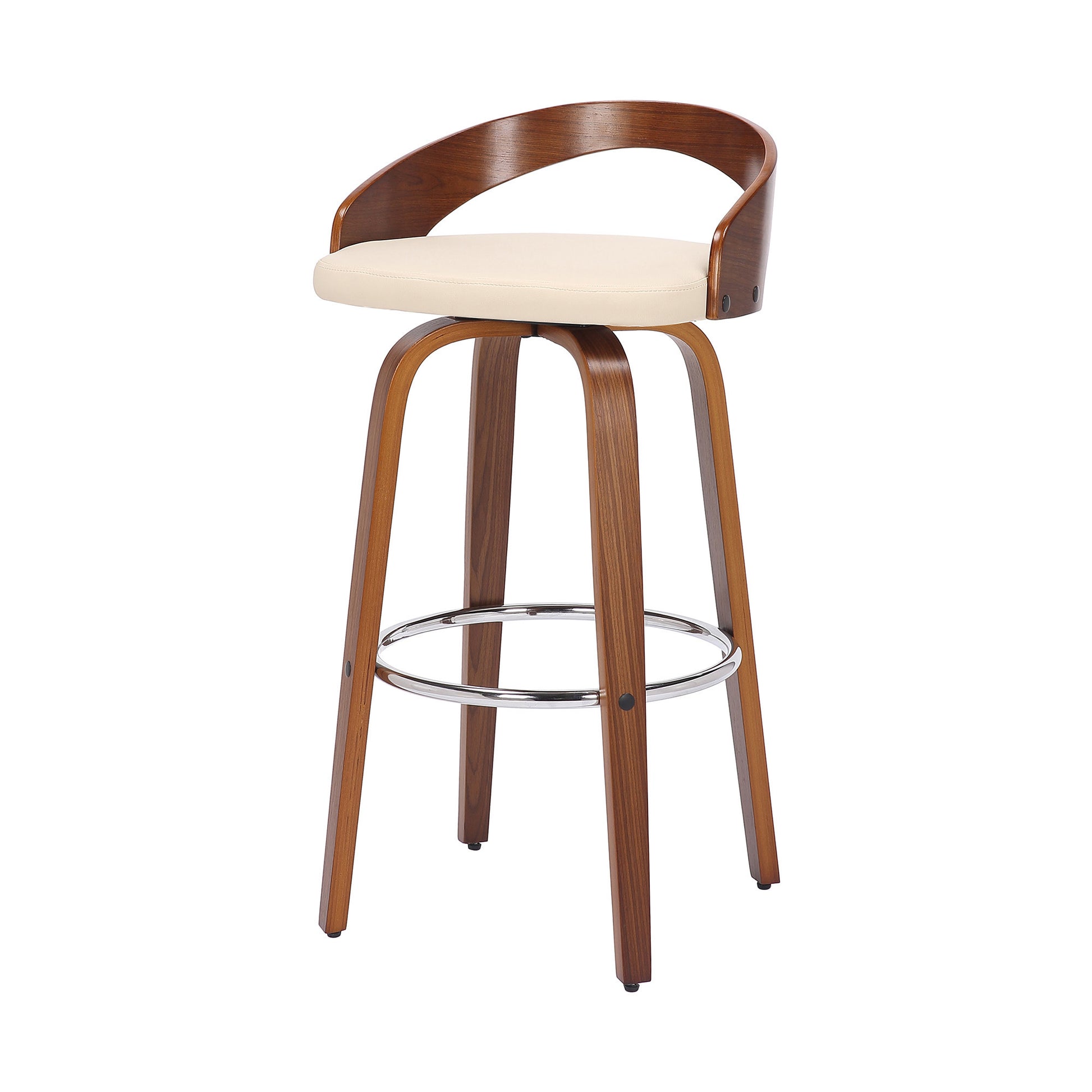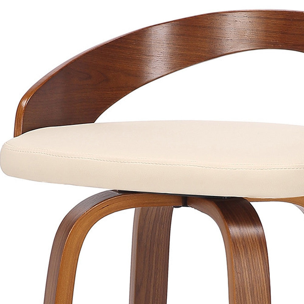 The perfect way to add some extra seating in your home, this 31" cream faux leather and solid wood swivel low back counter height bar chair will elevate the look and vibe of your room. Quality construction from walnut solid wood combines with cream faux leather to give this stool a fresh and updated look. Not only good looking and stylish, this chair features a round shaped seat and a low back for the ultimate in comfort and enjoyment. This stool will look great in your dining room, kitchen, bar, or recreation room. 31" H x 19" W x 19" D