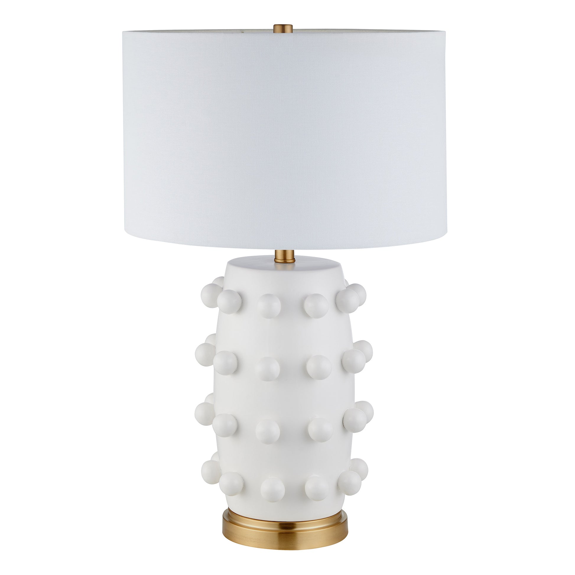 This 26-inch gold and white ceramic cylinder table lamp with white drum shade is a great way to add some brightness to any corner of your home. A gorgeous gold and white ceramic base brings just the right amount of pizzazz to this fabulous lamp. The white shade has a drum shape and is made from fabric. This standard table lamp is designed to provide general lighting to the area. The light that this lamp throws is soft and warm to elevate the look of most any space in your home. Bring some lite and good vibes into your space with this updated and stylishly designed lamp. 26-inch H x 16-inch W x 16-inch D