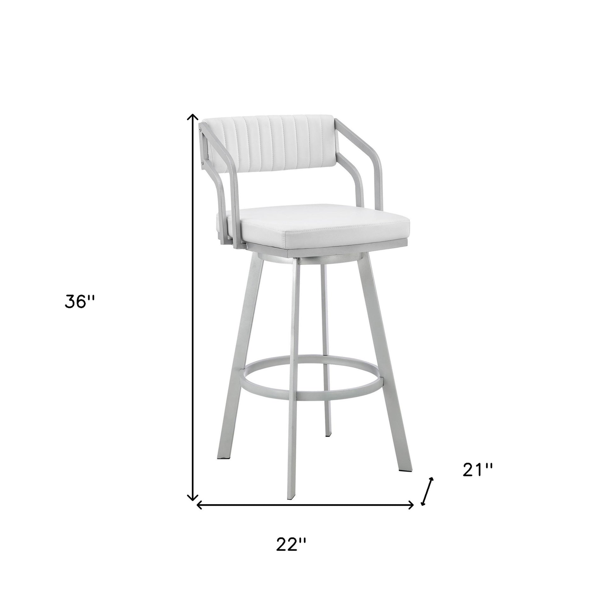 Enjoy all there is to be enjoyed as far as style is concerned with this 26" Timeless White Faux Leather Bar Stool. The metal frame does more than just providing support. It provides a beautiful contrast to the luxurious faux leather upholstery the stool adorns. Its low arm design is something to adore as it allows you to enjoy enough stability when seating. The full 360-degree swivel effect can make you turn in different directions effortlessly whenever you want. The stool also features a channel style stitching on the back while the plush seat with an open lower back provides comfortable and breathable seating. 36 x 21 x 22