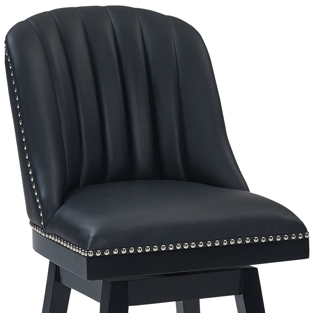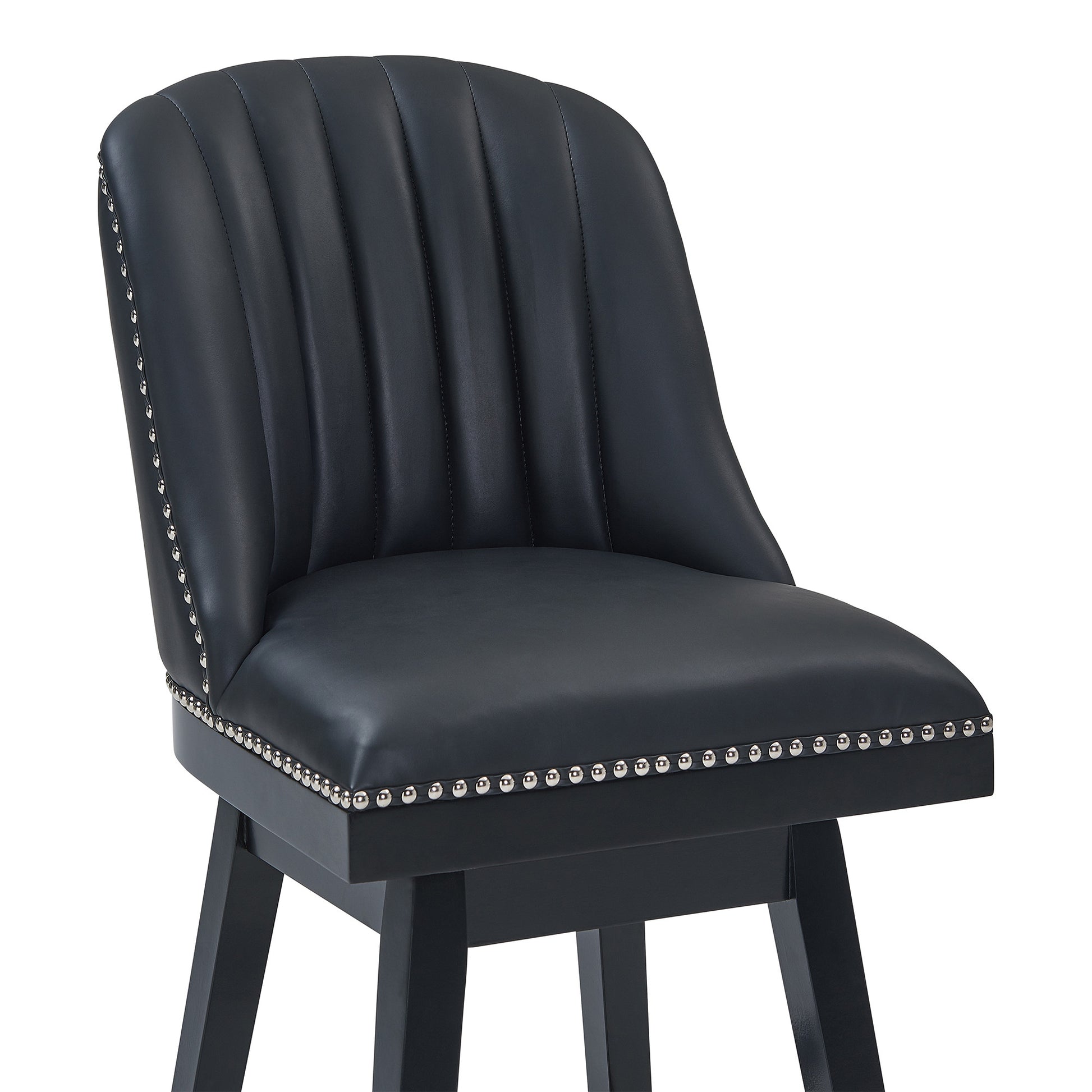 Introduce a trendy bar atmosphere into your space with this stylish 27-inch all over black round bar chair. Crafted from durable black solid acacia wood and adorned with a sleek faux leather seat, this counter height chair effortlessly combines comfort and style. Its swivel feature allows for easy movement, while the thoughtful inclusion of a footrest enhances your overall comfort. Perfect for any modern home, it's the ideal addition to your kitchen island or home bar. 42-inch H x 19.5-inch W x 24.5-inch D