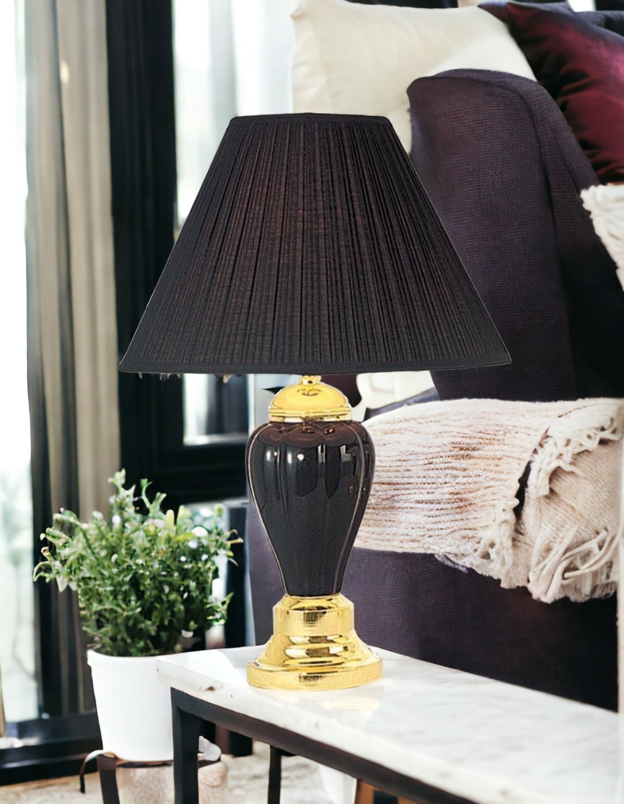 This 27-inch gold ceramic bedside table lamp with black empire shade is a great way to add some brightness to any corner of your home. The base of this lamp is made of ceramic finished in a gold tone. The black shade has a empire shape and is made from linen. Bedside table lamps help to add a soft and cozy glow to your bedroom. Great for evening reading. Use this lamp anywhere and elevate the look of the whole space. The perfect lamp to create just the right natural and soothing light in your space. 27-inch H x 16-inch W x 16-inch D