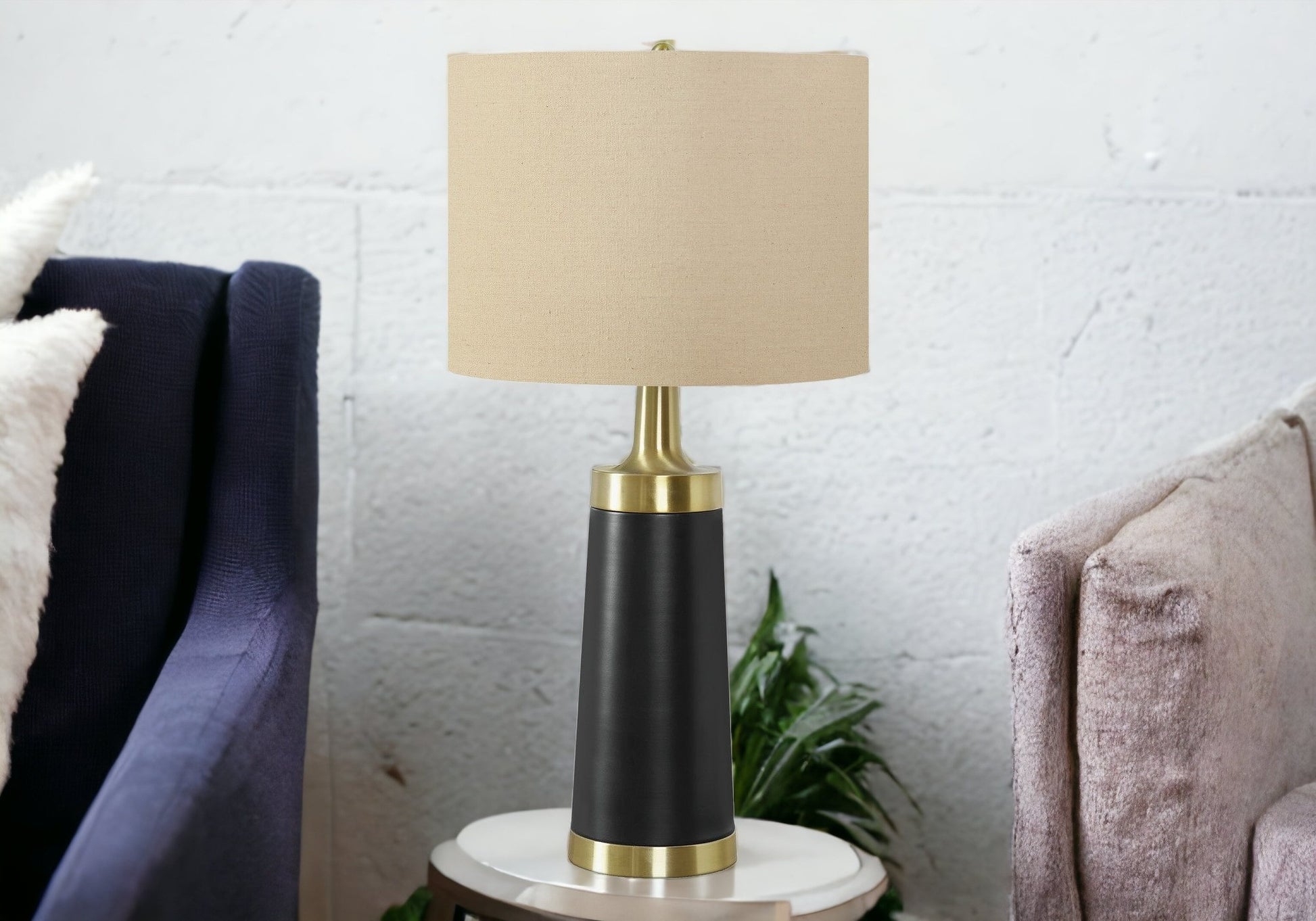 Truly a mix of design and functionality that doesn't compromise on style, this 28-inch black and gold metal cylinder table lamp with beige drum shade will be a great addition to your space. The base of this lamp is made of metal finished in a black and gold tone. The beige drum linen shade is a great compliment to this lamp. This standard table lamp is designed to provide general lighting to the area. Use this lamp anywhere and elevate the look of the whole space. Bring some lite and good vibes into your space with this updated and stylishly designed lamp. 27.5-inch H x 14-inch W x 14-inch D