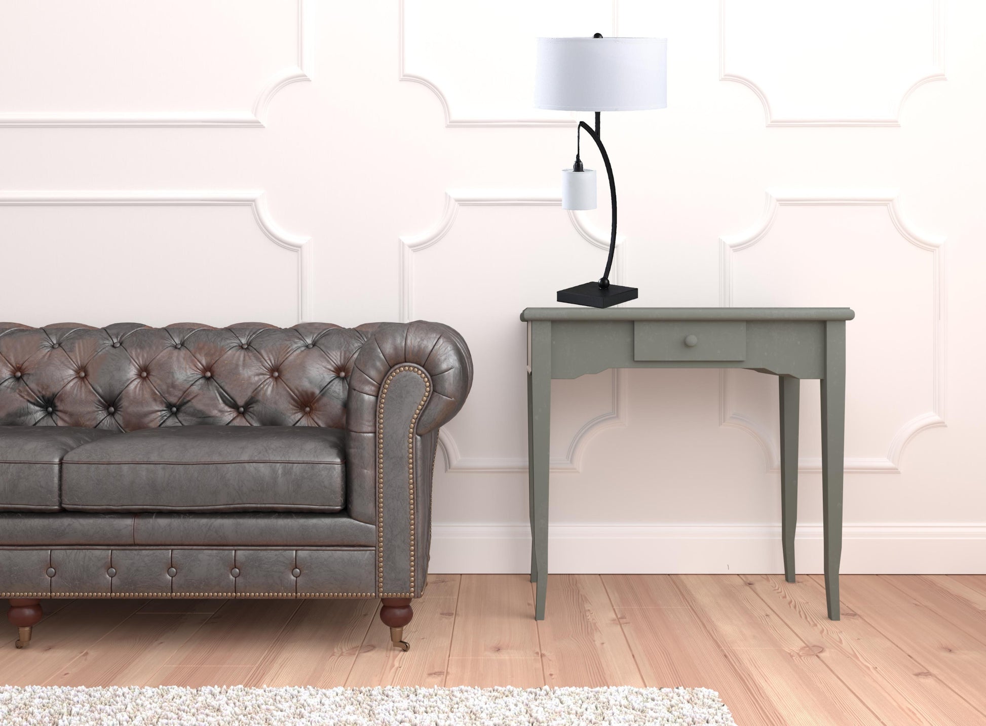 Embrace the good life with this hard working and stylish 29" black metal two light arched table lamp with white drum shade. A gorgeous black metal base has a large light and then a smaller hanging pendulum light as well. The crisp white shades have a drum shape and are made from fabric. A sophisticated take on a classic, this arched table lamp is a great option for a unique look. High quality design makes this a great lamp for not only lighting, but accenting a room with style. It is perfect for virtually any decor. 28.5" H x 15" W x 15" D