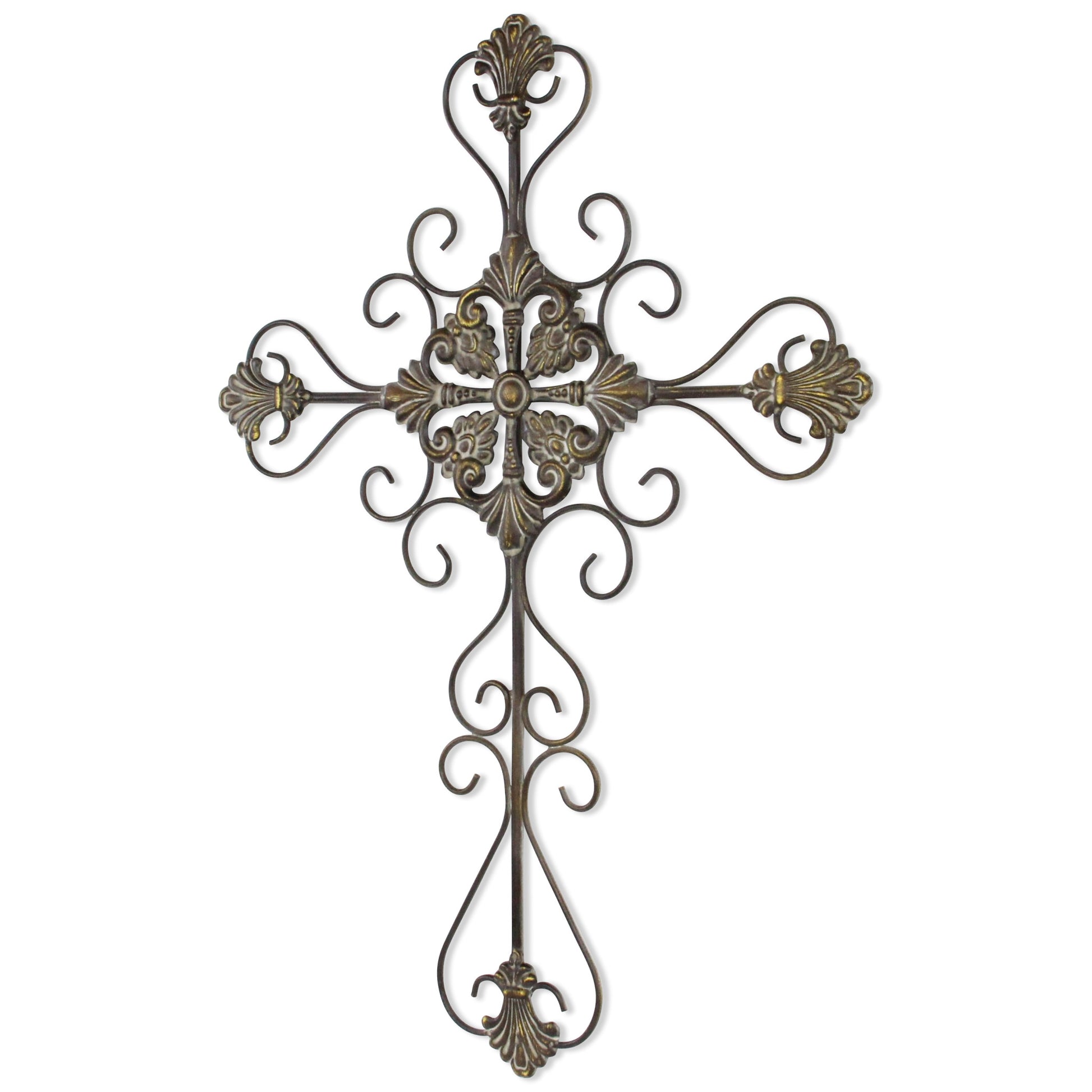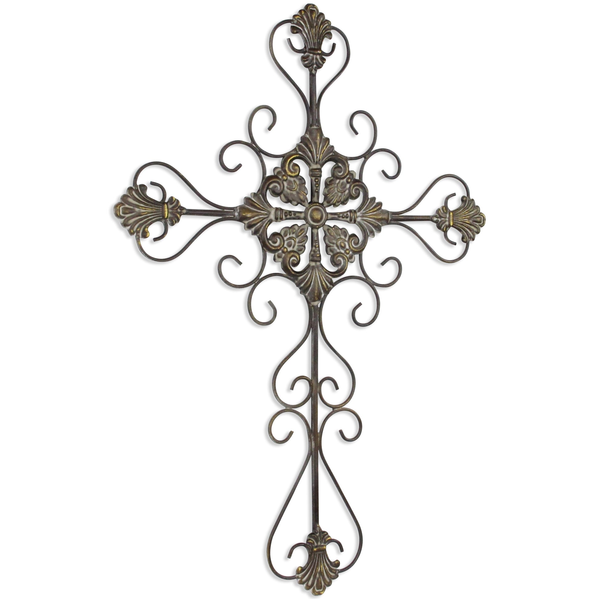 Unique and decorative, this 29-inch gray metal scroll design gray hanging cross wall decor will leave a lasting impression. Handcrafted from high grade metal, this scrolling metal cross is a great way to proclaim your faith and add some decorative touches to your room at the same time. Utilize this opportunity to create a focal point in the room with this spiritual wall decor option. 28.7-inch H x 21-inch W x 1-inch D