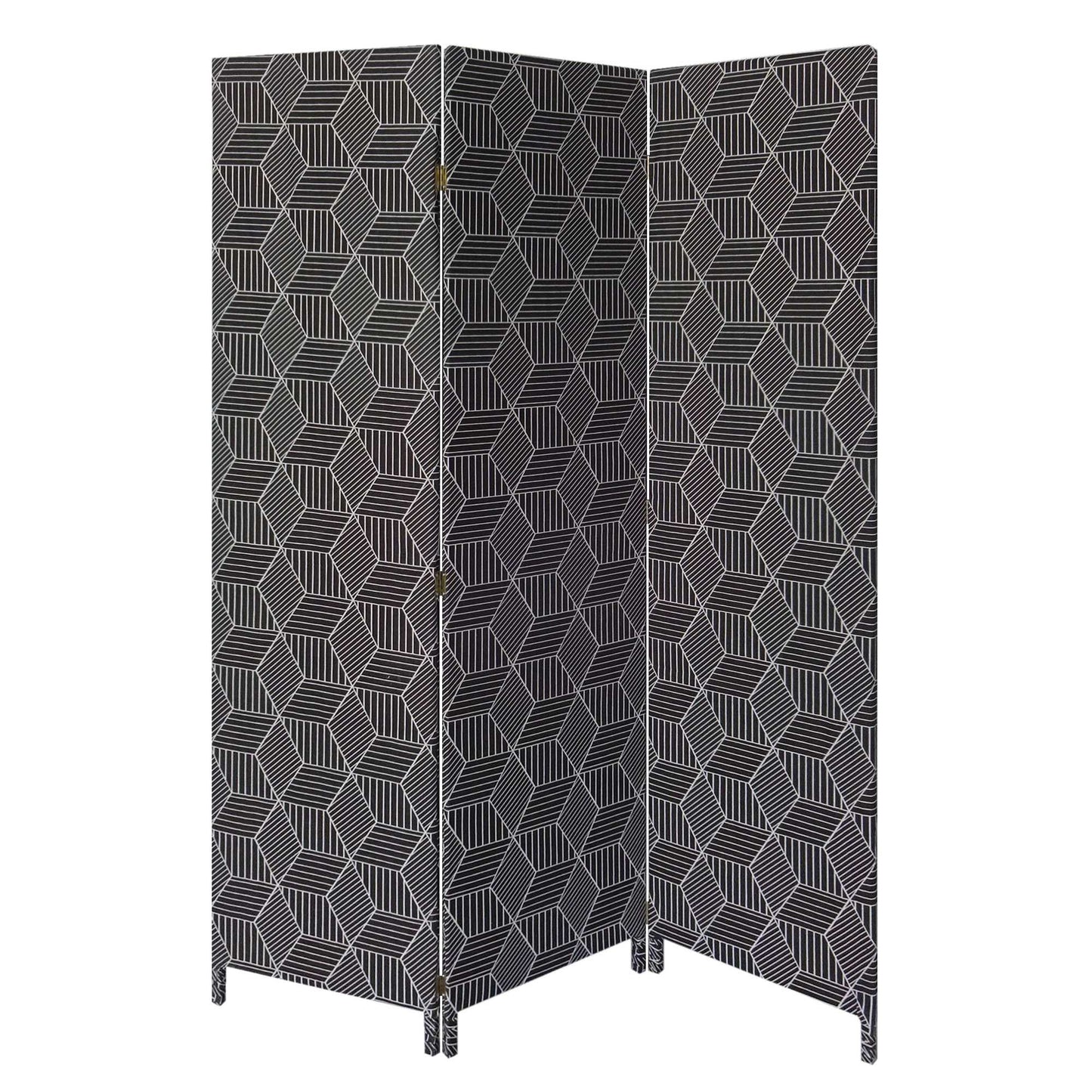This 3 panel room divider is great for sectioning off any space in any room and serves as a beautiful accent. Constructed from solid wood panels with a soft fabric finish. The soft fabric features a black and white geometric pattern that creates an attractive contemporary design. This room divider is an excellent item to have in your home or any place, it is transitional, very light-weight, and easy to store. Finished on both sides.