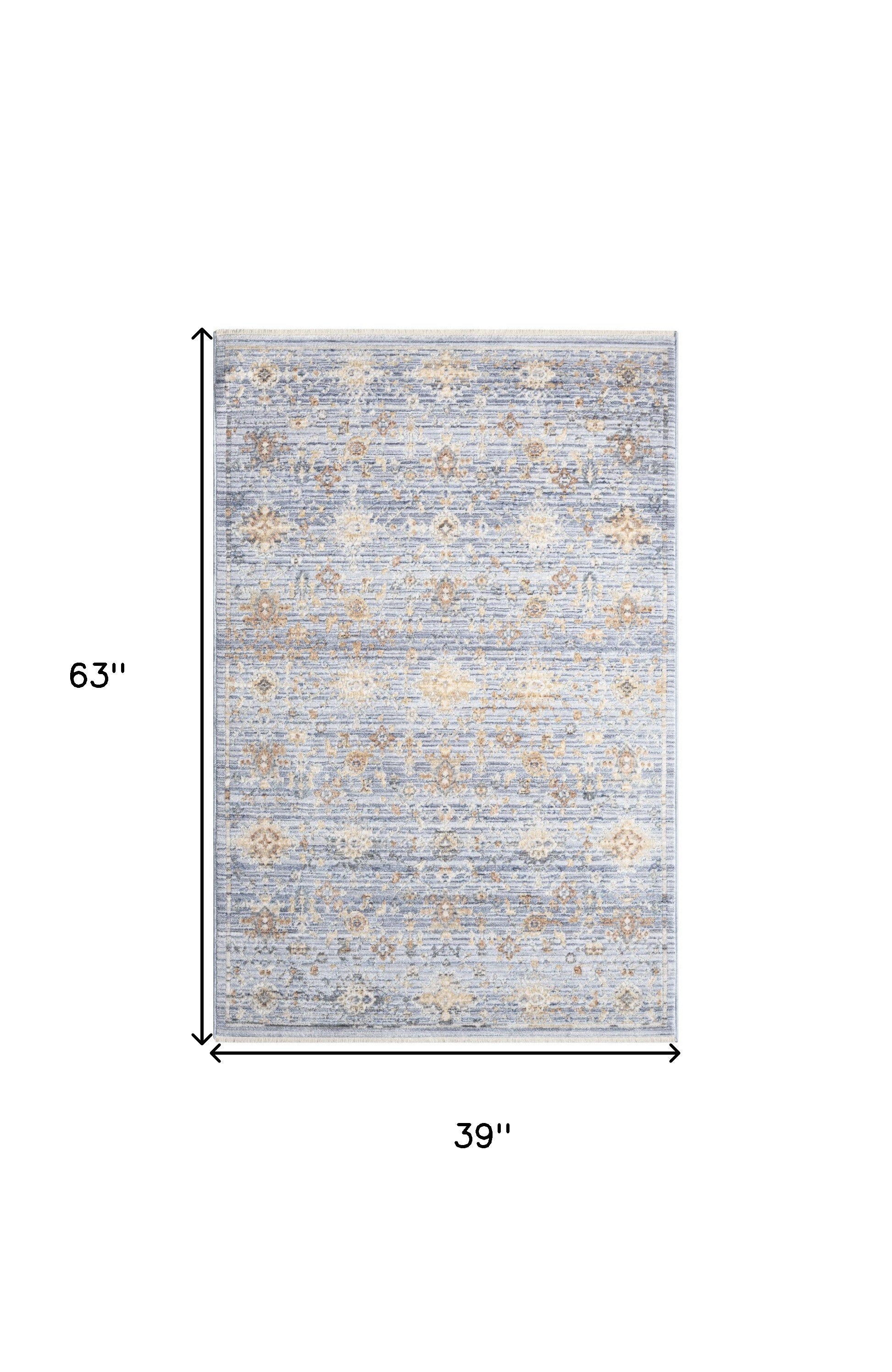 3' X 5' Blue and Ivory Oriental Power Loom Distressed Area Rug With Fringe