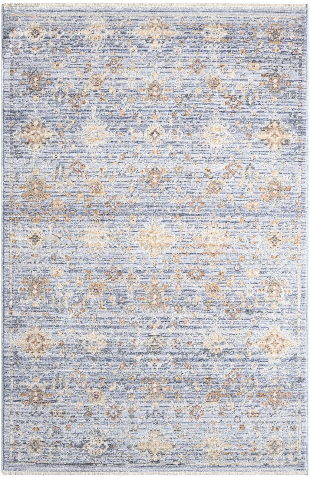 Set an inviting tone in your space with this 3-foot x 5-foot blue and ivory oriental power loom distressed area rug with fringe. This rectangle shaped rug features a oriental design in blue and ivory to give it visual interest. A classic shape marries with good looking design for your space Tassel ends bring a timeless and fashionable look to your interior. Area Rugs help to give warmth and sense of home to your space. .25-inch H x 39.00-inch W x 63.00-inch D