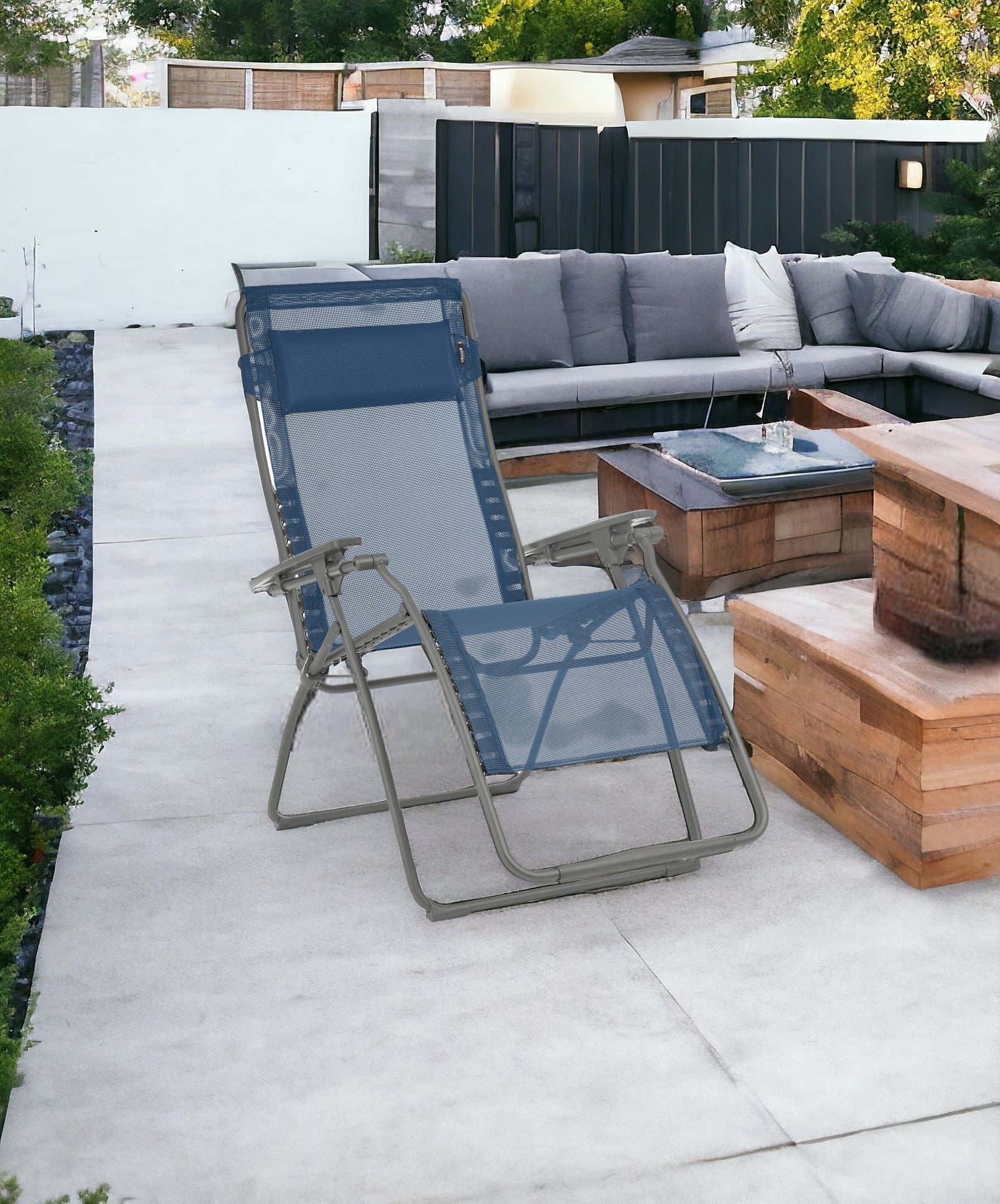 Let gravity take over your senses as you lean back into the 30-inch blue and gray metal zero gravity chair. This unique chair suspends your body while you sit, creating a weightless sensation. Arms give this chair shape and definition and make it a good looking and comfortable option. Lounge like a superstar in this sling style seat that hugs you with its ergonomic design, good looks, and clean lines. Enjoy the good life everyday with this fashionable outdoor seating option. 49.2-inch H x 29.9-inch W x 35.4-inch D