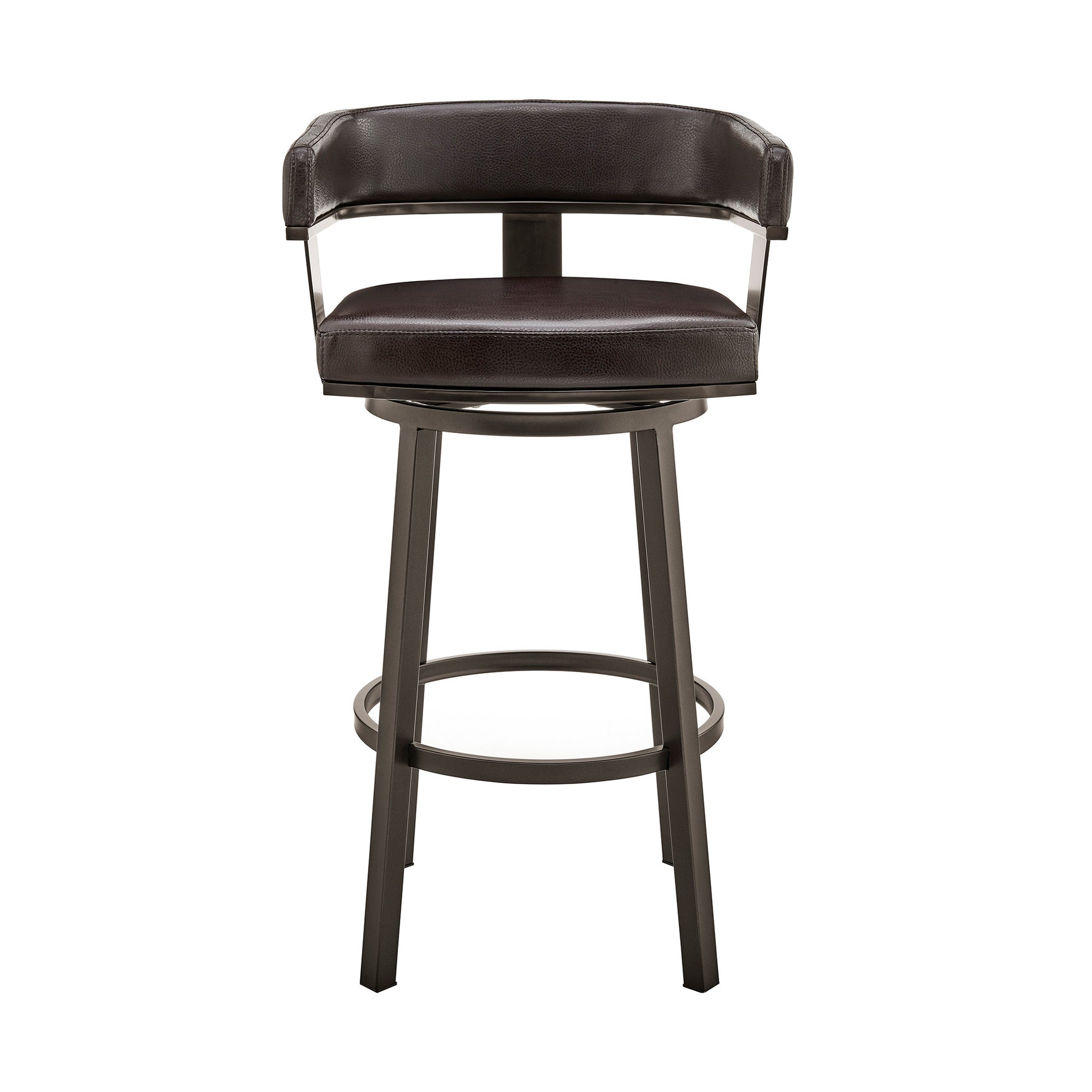 30" Chocolate And Gray Faux Leather And Iron Swivel Low Back Bar Height Bar Chair