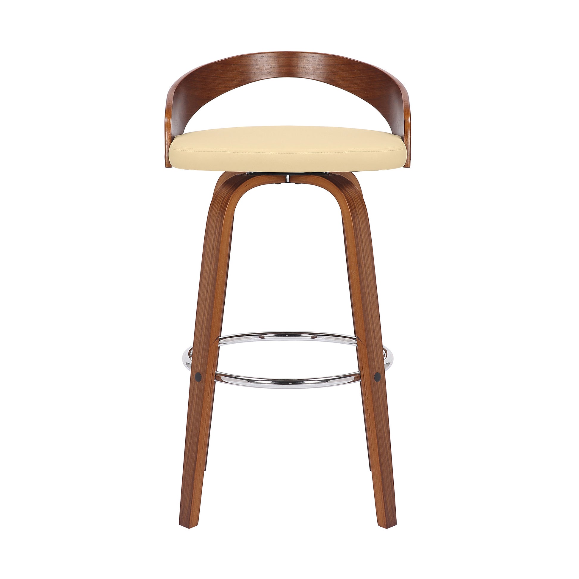 The perfect way to add some extra seating in your home, this 30" cream and brown faux leather and solid wood swivel low back bar height bar chair with footrest will elevate the look and vibe of your room. The base of this stool is made from solid wood in a brown color that is a nice contrast to the cream faux leather seat. The round shape of the seat combines with a low back to give this chair a comfortable and fashionable look. Designed with a footrest for comfort and convenience. 35" H x 19" W x 19" D