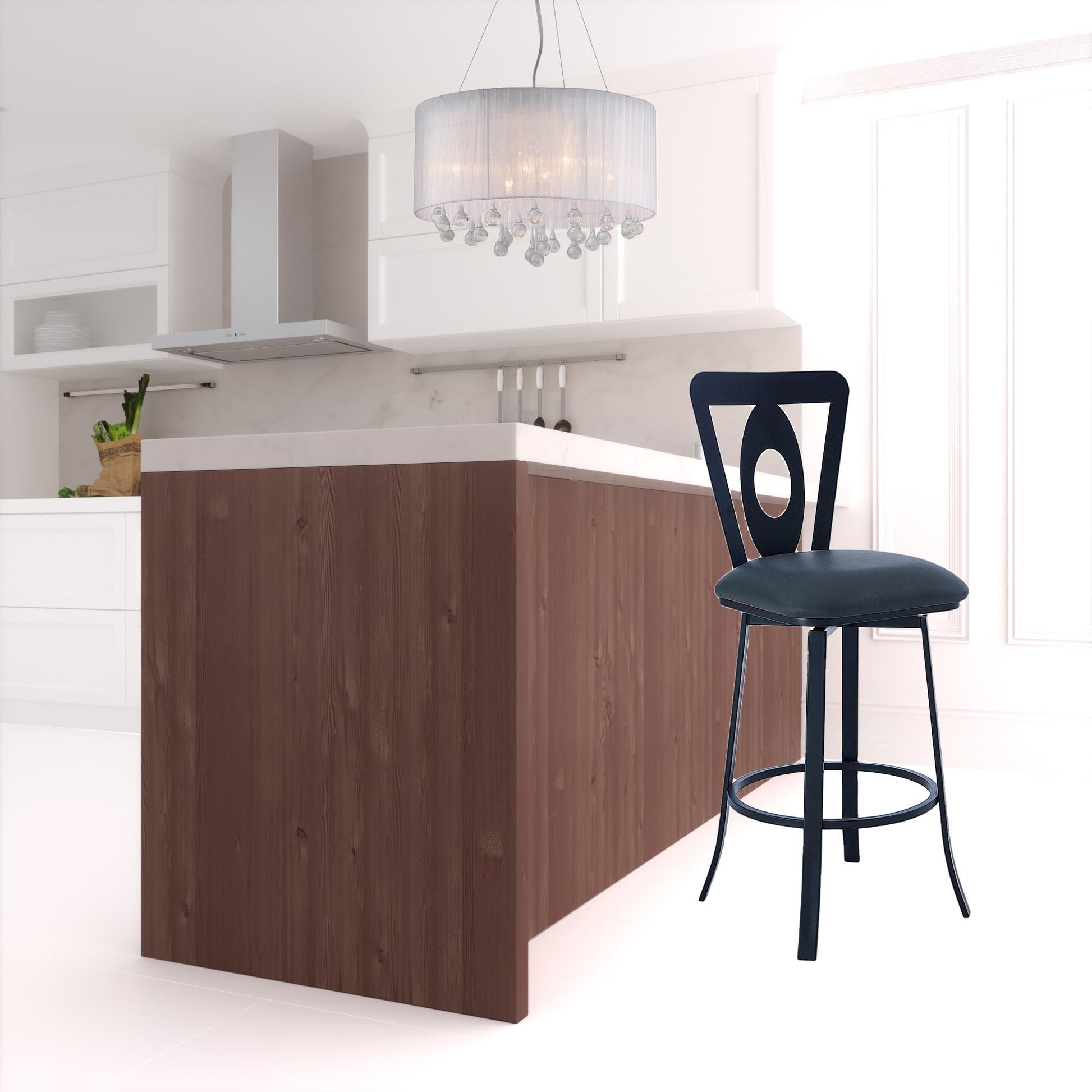 Comfortable enough to sit in for awhile, this 46" gray faux leather and iron swivel bar height chair will transcend the look of your room. Quality construction from matte black iron combines with gray faux leather to give this stool a fresh and updated look. The round shape of the seat combines with a full back to give this chair a comfortable and fashionable look. This stool will look great in your dining room, kitchen, bar, or recreation room. 46" H x 21" W x 18" D