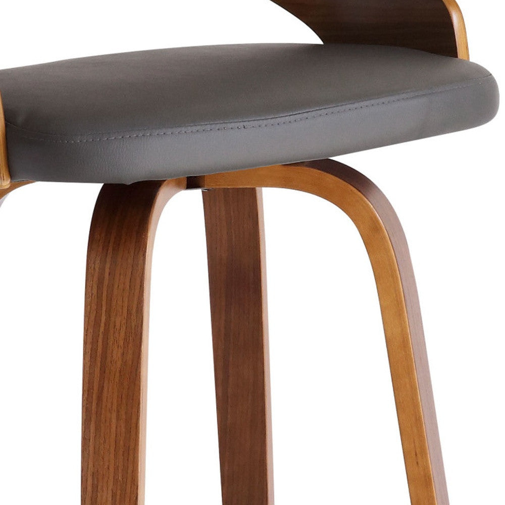 Bring a trendy bar vibe to your space, with this 35" gray and brown faux leather swivel low back bar height chair with footrest. A brown iron frame is finished off with a gray faux leather seat that is the epitome of quality construction and design. Not only good looking and stylish, this chair features a round shaped seat and a low back for the ultimate in comfort and enjoyment. Designed with a footrest for comfort and convenience. 35" H x 19" W x 19" D