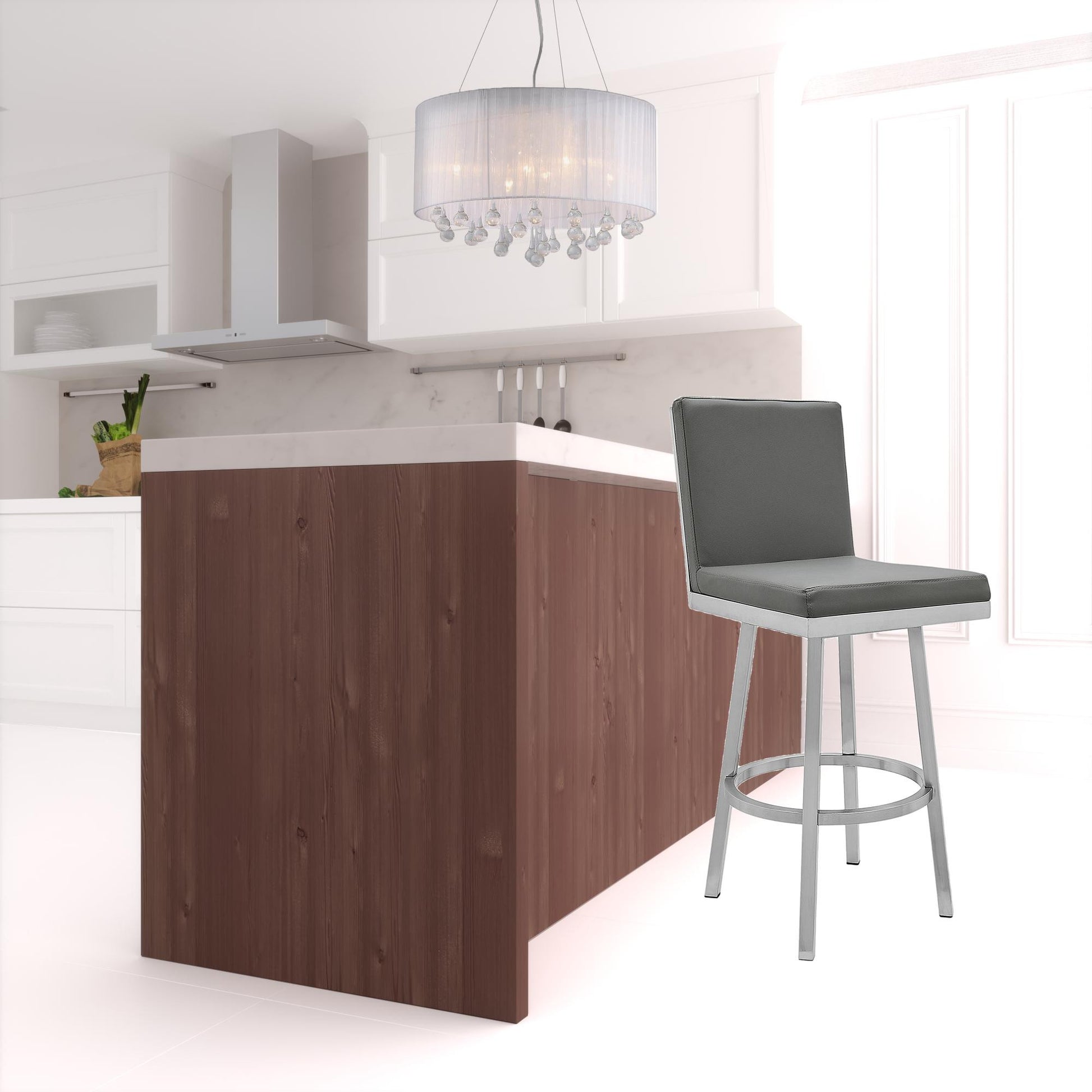 This 30-inch gray and silver faux leather and iron swivel bar height bar chair with footrest will be the perfect way to add some cool design and utility to your space similar to what you find in your favorite cafes or pubs. The silver coloration of the high quality iron base marries nicely with the gray faux leather seat. The round shape of the seat combines with a full back to give this chair a comfortable and fashionable look. Designed with a footrest for comfort and convenience. 44-inch H x 19-inch W x 23-inch D