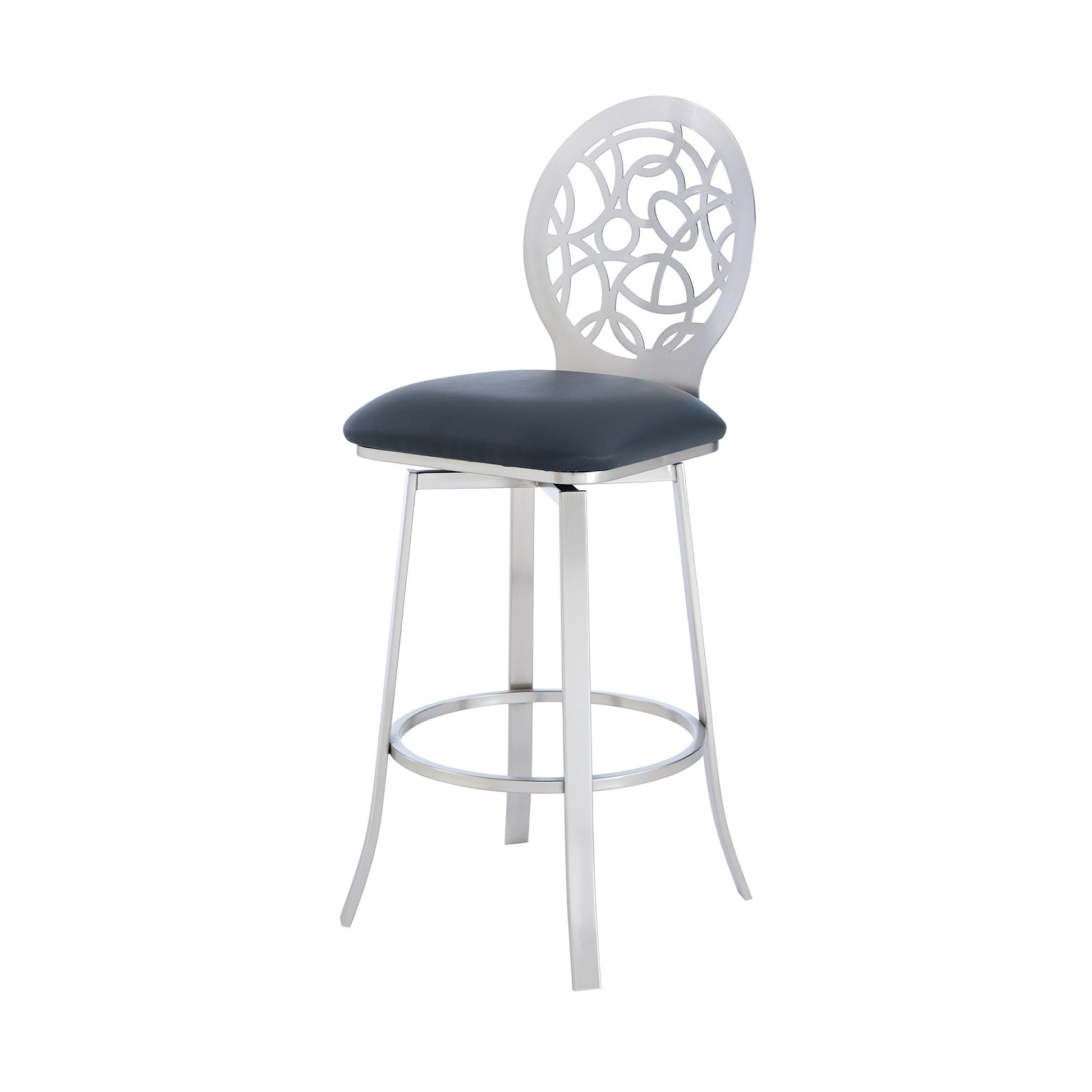 30" Gray And Silver Faux Leather And Iron Swivel Bar Height Bar Chair