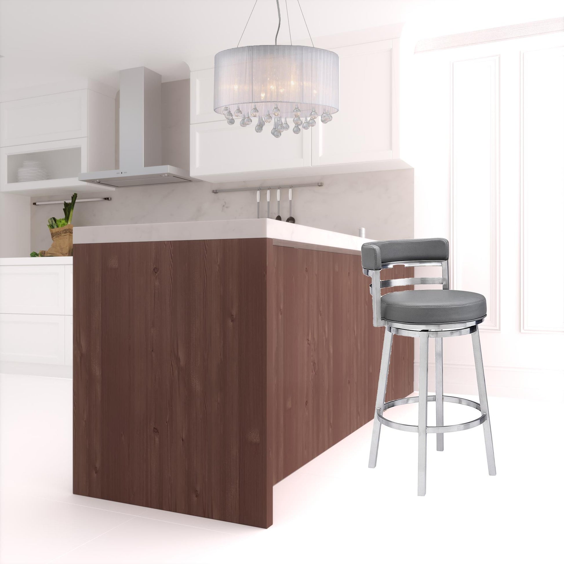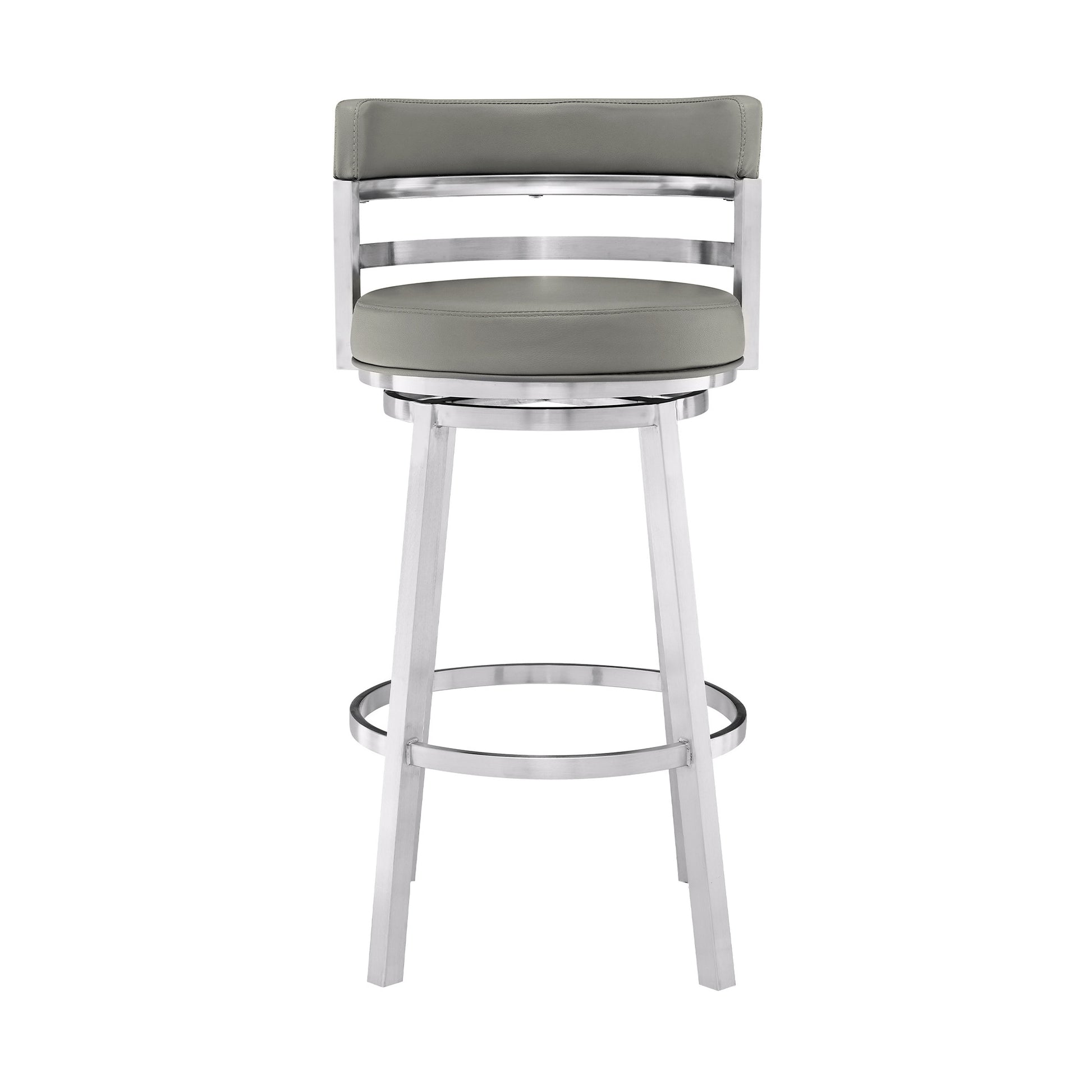 Comfort and design come together nicely in this 39" gray faux leather and stainless swivel low back bar height chair. The gray faux leather seat of this stool is a nice contrast to the high quality, brushed stainless steel iron of the base. A low back mixed with a round shaped seat design makes this chair both comfortable and fashionable. The armchair design gives you a great place to comfortably rest your arms. 39" H x 20" W x 21" D