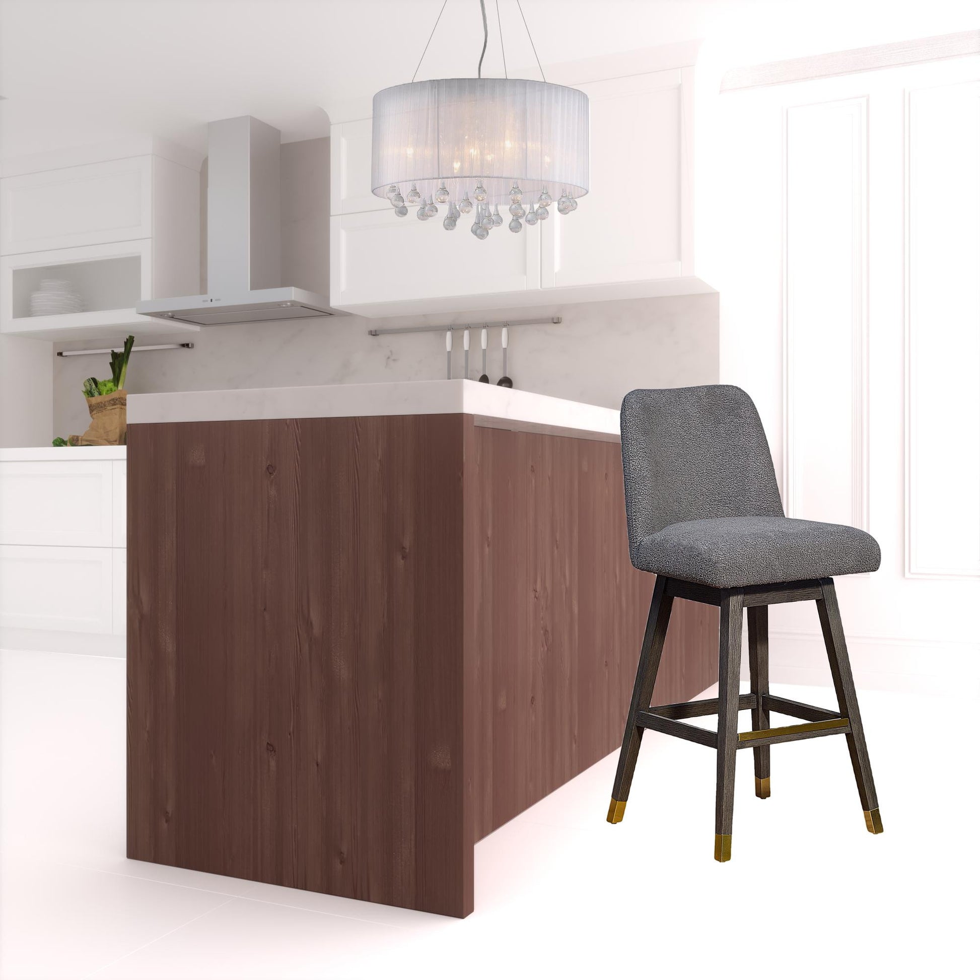Comfort and design come together nicely in this 30" grey and gray solid wood swivel bar chair with footrest. A sleek gray monotone color gives this solid wood and upholstered stool a fresh and updated look. 41.5" H x 21.5" W x 19" D