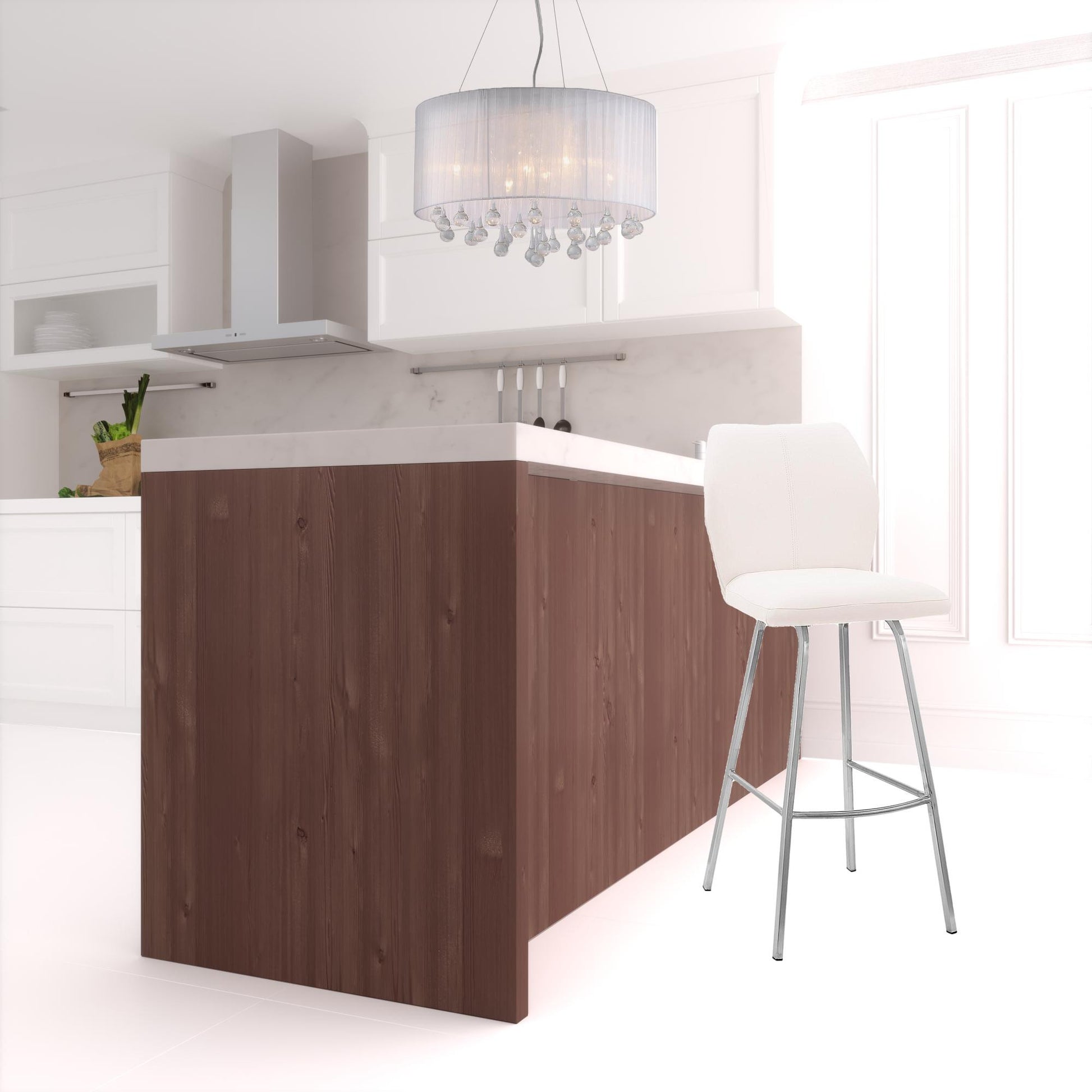 With this 42" white faux leather and iron bar height chair you can add design and extra seating to your space. The brushed stainless steel coloration of the high quality iron base marries nicely with the white faux leather seat. Not only good looking and stylish, this chair features a round shaped seat and a full back for the ultimate in comfort and enjoyment. A great seating option, this stool will bring a unique look to any room. 42" H x 17" W x 21" D