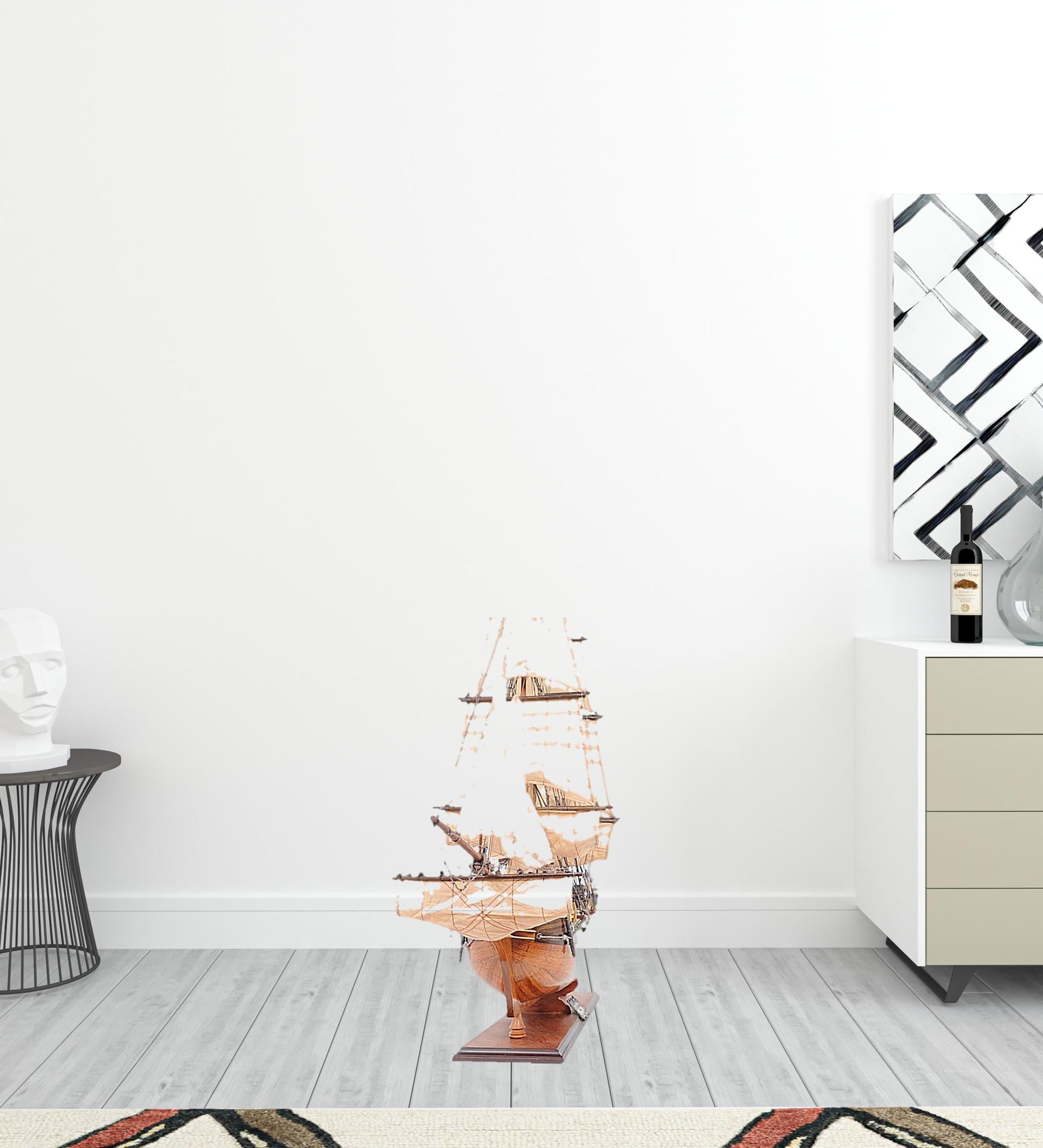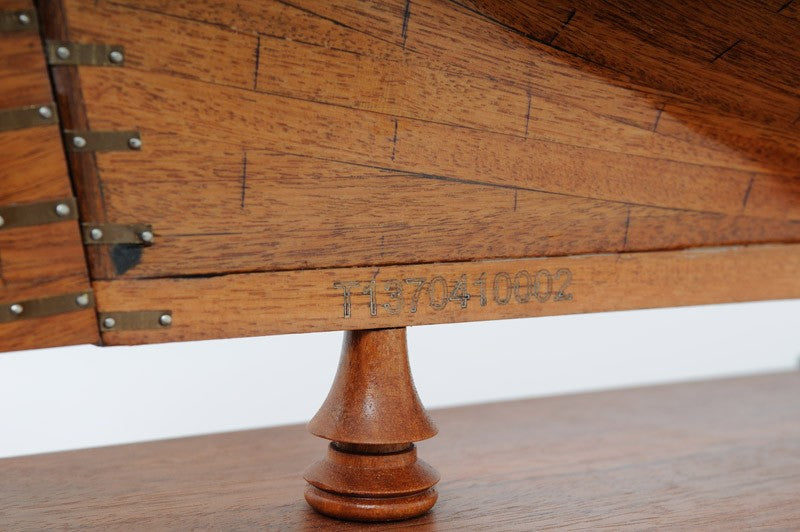 Eye-catching and incredibly detailed, the HMS Bounty 1787 Ship Model is a unique hand-built model of the famous British Royal Navy ship burned by mutineers. Handmade by the most talented craftsman using high-quality wood like western red cedar, rosewood, mahogany, and other exotic wood. Each model requires hundreds of hours of painstaking plank-on-frame construction and detailing. It includes incredible details as three masts, cannons on each side, hand-stitched linen sails, wooden boats, a bell tower, and other intricate details. Comes with a solid wood base and brass nameplate making it a true gem for any collector or maritime enthusiast. 30" H x 37" W x 10" D