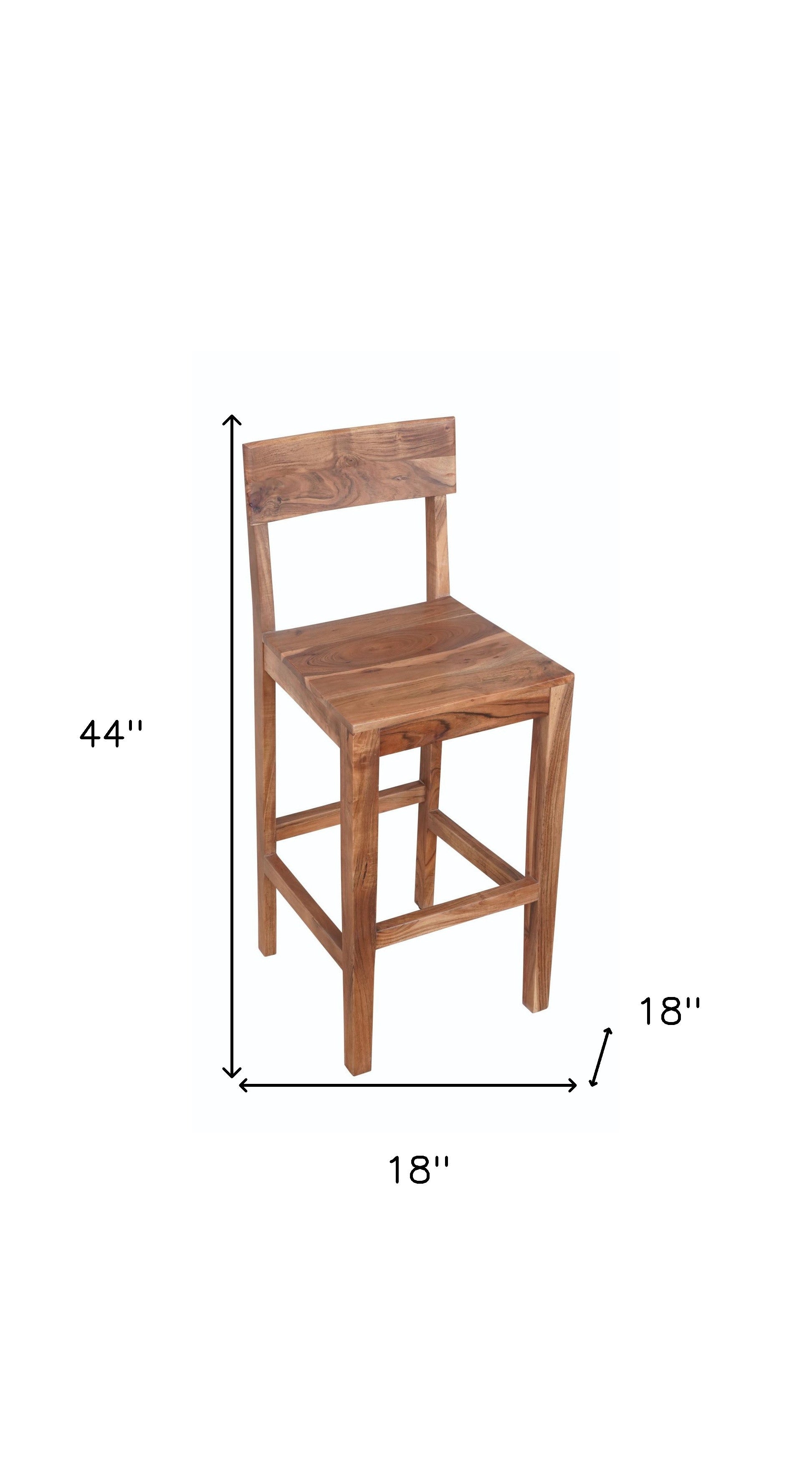 Comfort and design come together nicely in this 30" wood brown bar height bar chair with footrest. A sleek wood brown monotone color gives this solid wood and solid wood stool a fresh and updated look. The square shape of the seat combines with a full back to give this chair a comfortable and fashionable look. Designed with a footrest for comfort and convenience. 44" H x 18" W x 18" D