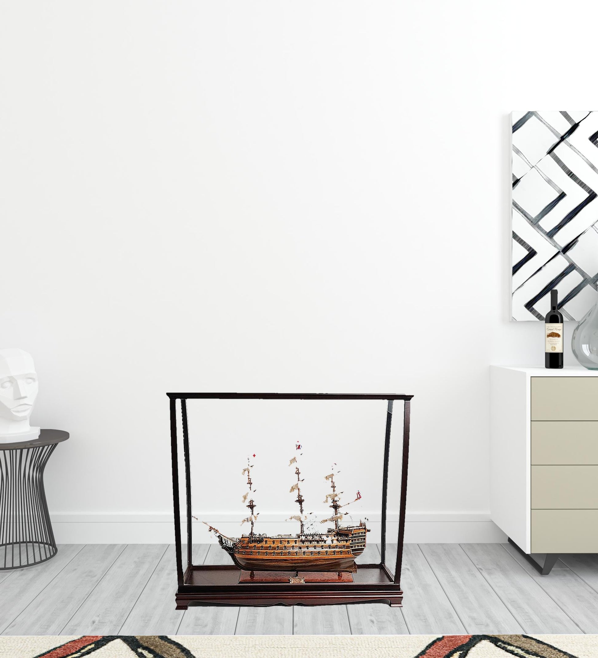 Magnificent and incredibly detailed replica, the HMS Victory Medium Display Case Ship Model is a unique hand-built model of the legendary British Navy flagship commanded by Lord Nelson at the Battle of Trafalgar. Handmade by the most talented craftsman using high-quality western red cedar, rosewood, and mahogany. It features three large masts, and incredible details as captains sleeping and dining cabin, authentic handmade lifeboats and an exquisitely detailed admirals quarter. It comes in a display case with a solid wood base and a brass nameplate making it perfect for displaying. It is a sought-after piece for any history or maritime enthusiast. 31.5" H x 34" W x 13" D