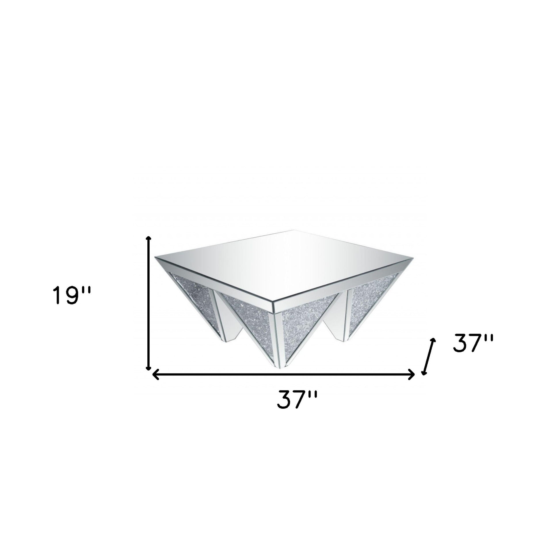 Make a statement with the 37-inch silver glass square mirrored coffee table and infuse a dash of character and personality into your space. A sleek silver monotone color gives this manufactured wood and glass table a fresh and updated look. Reflective pieces of mirrored glass give this table a glamorous and unique look. This square table utilizes its unique shape to give your room a modern geometric accent. It has a fresh design that will definitely breathe some fresh air into your interior. This coffee table is the sturdy, reliable and stylish answer to your living room needs. 19-inch H x 37-inch W x 37-inch D
