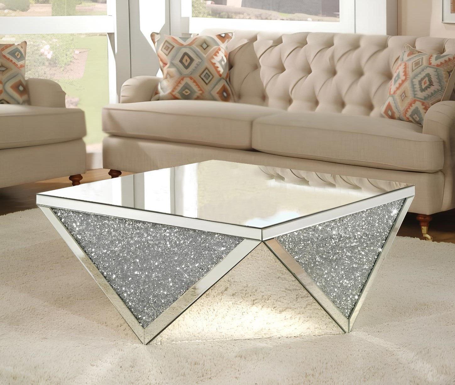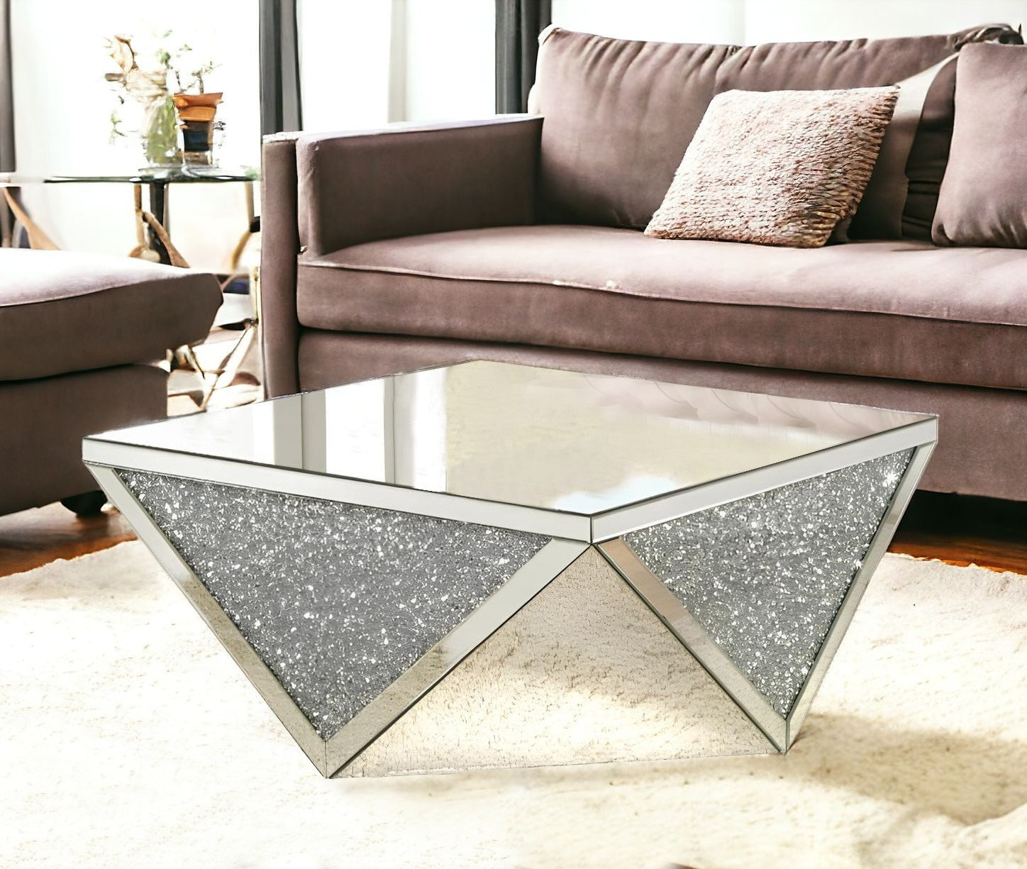 Give your living room, family room, or office the perfect anchor piece with this 38-inch silver glass square mirrored coffee table. This table features an updated monotone color scheme with silver as the main color on both the glass top and the manufactured wood base. Reflective pieces of mirrored glass give this table a glamorous and unique look. This square table features a fresh and stylish shape to give your room a visually pleasing accent. If you're looking for something that can fit into a living area, bedroom, or office, this coffee table is for you. This coffee table is the sturdy, reliable and stylish answer to your living room needs. 19-inch H x 38-inch W x 38-inch D