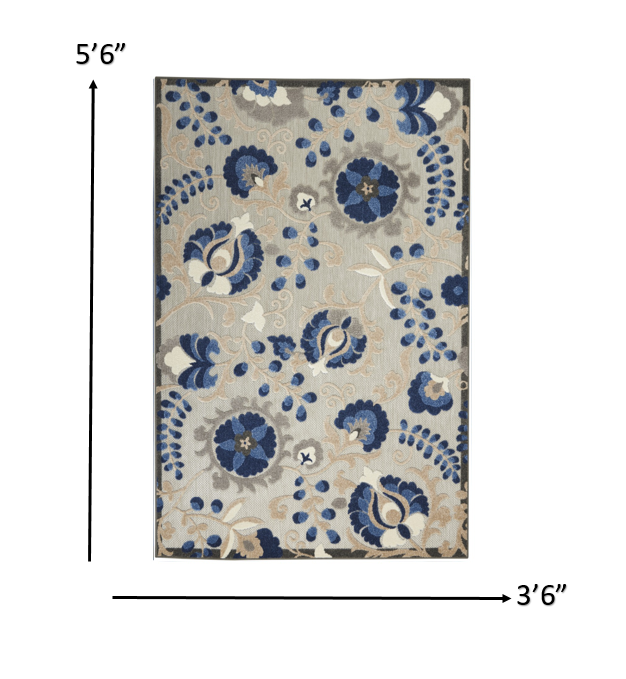 4' X 6' Blue And Gray Floral Indoor Outdoor Area Rug