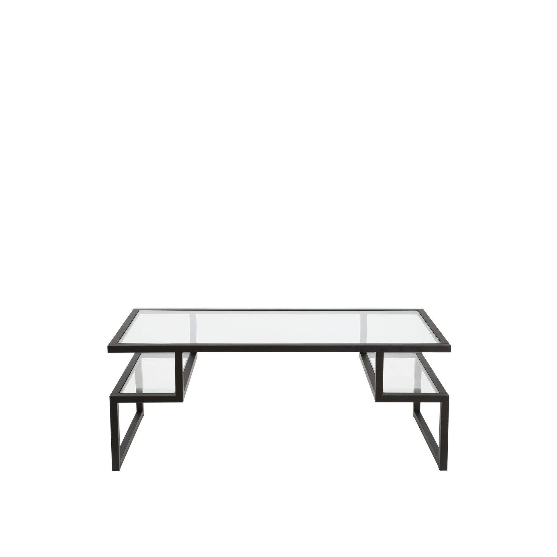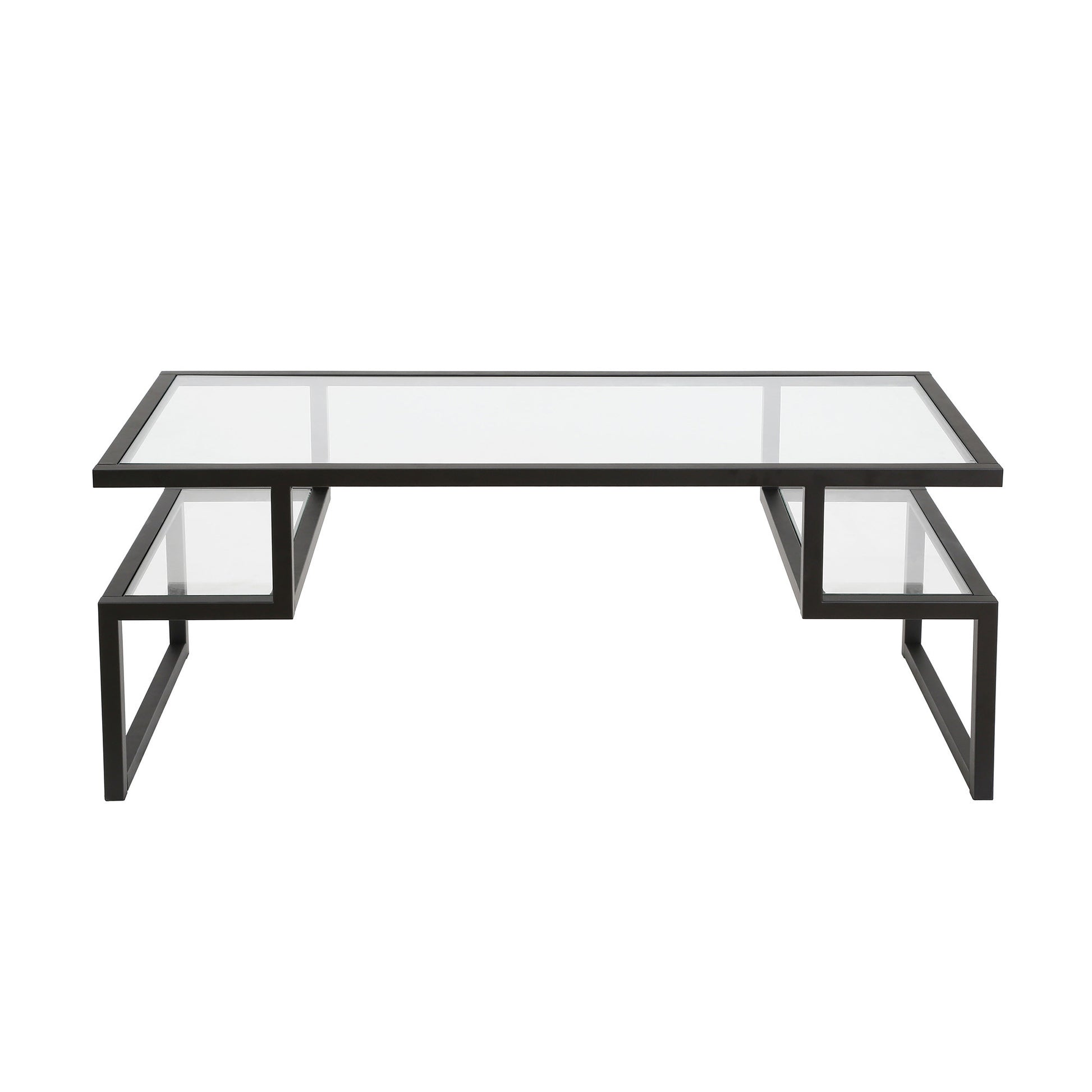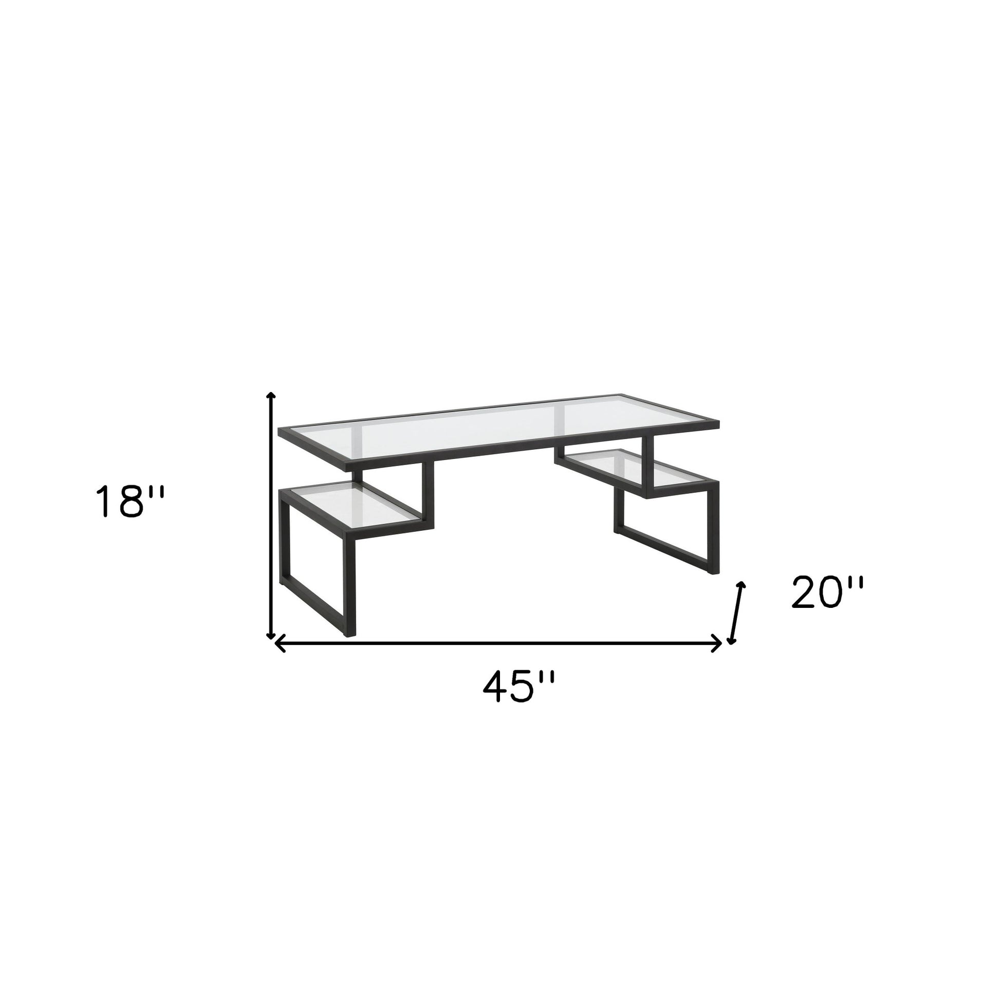 This good looking 45-inch black glass and steel coffee table with two shelves is sure to inspire compliments no matter where it sits. This table features an updated monotone color scheme with black as the main color on both the glass top and the steel base. There are 2 shelves that will help to keep clutter at bay. This rectangular table is an classic yet updated way to accent your room. If you're looking for something that can fit into a living area, bedroom, or office, this coffee table is for you. This coffee table is the sturdy, reliable and stylish answer to your living room needs. 18-inch H x 45-inch W x 20-inch D