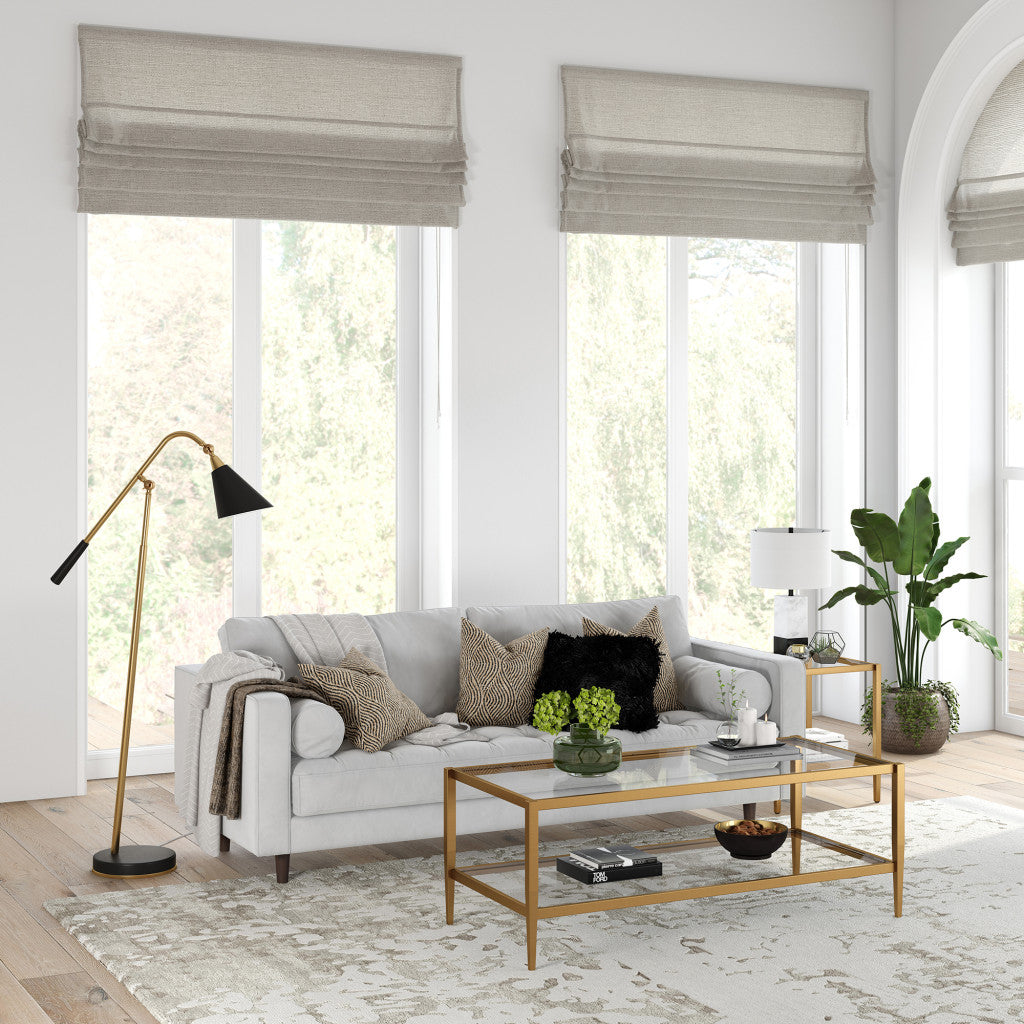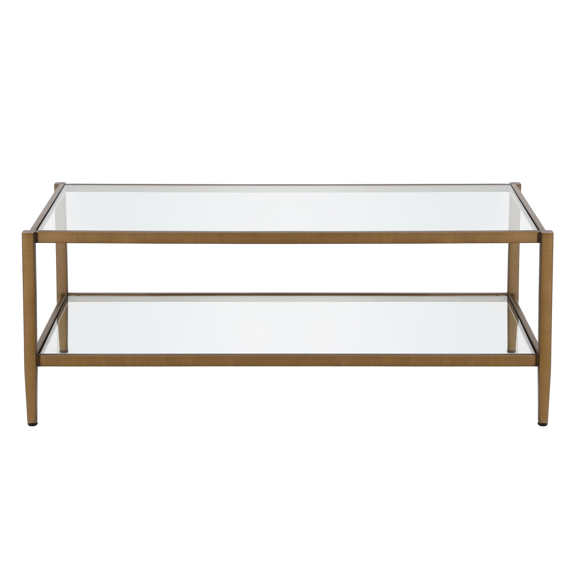Stylish and super sturdy, the 45-inch gold glass and steel coffee table with shelf is an amazingly good looking coffee table that will compliment your living room. A sleek gold monotone color gives this steel and glass table a fresh and updated look. Includes a single shelf for handy storage or display space. This classic rectangular table will be a great accent in any room if you're looking for something that can fit into a living area, bedroom, or office, this coffee table is for you. This coffee table is the sturdy, reliable and stylish answer to your living room needs. 17-inch H x 45-inch W x 20-inch D