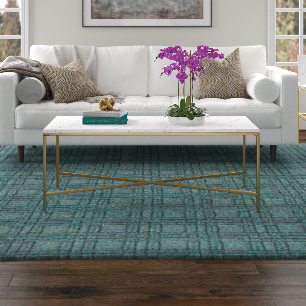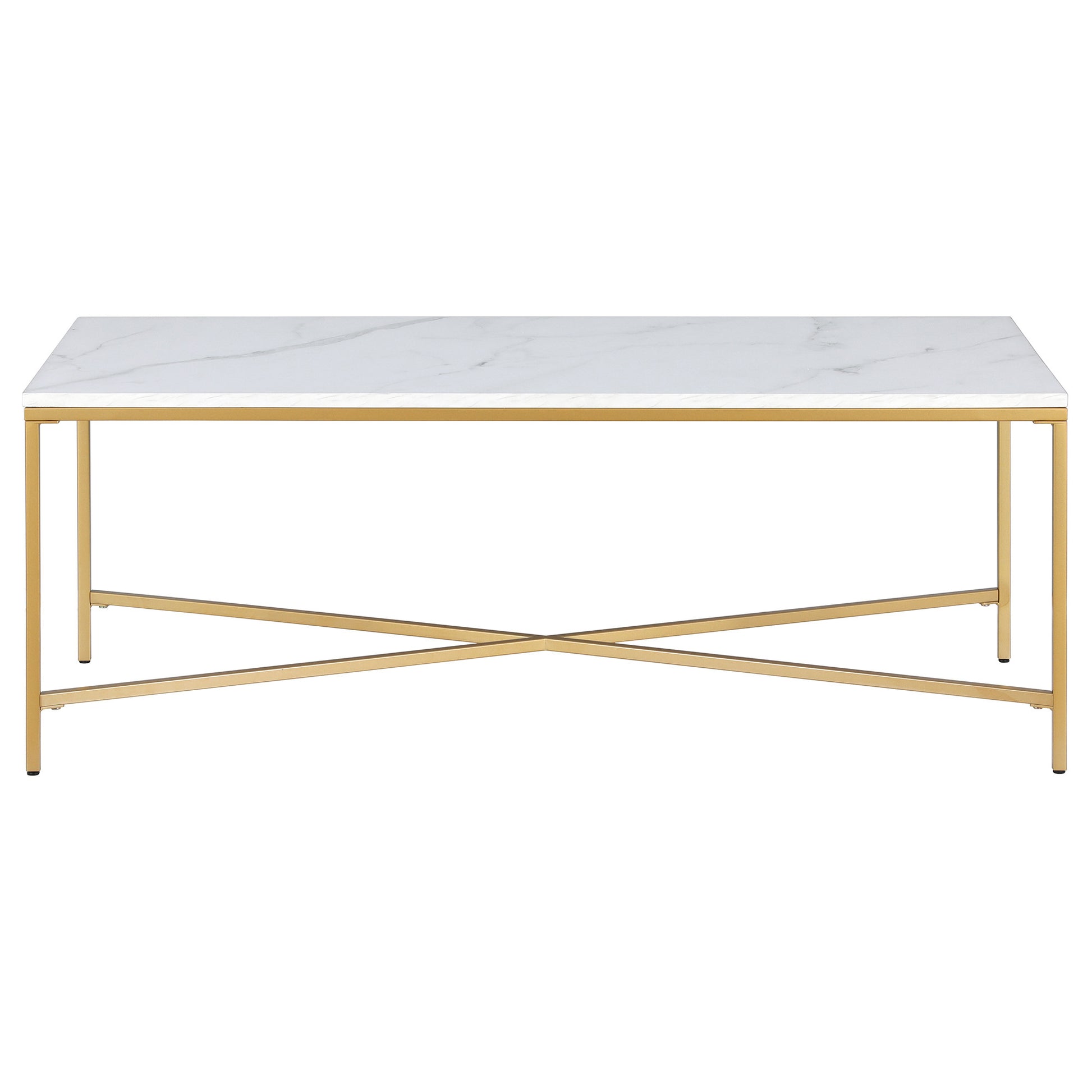 Add handsome, fashionable design to your living space with this 48-inch white and gold steel coffee table. The base of this table is made from steel in a gold color that creates a good looking visual contrast to the white manufactured wood tabletop. This rectangular table is an classic yet updated way to accent your room. If you're looking for something that can fit into a living area, bedroom, or office, this coffee table is for you. This coffee table is the sturdy, reliable and stylish answer to your living room needs. 18-inch H x 47.63-inch W x 23.75-inch D