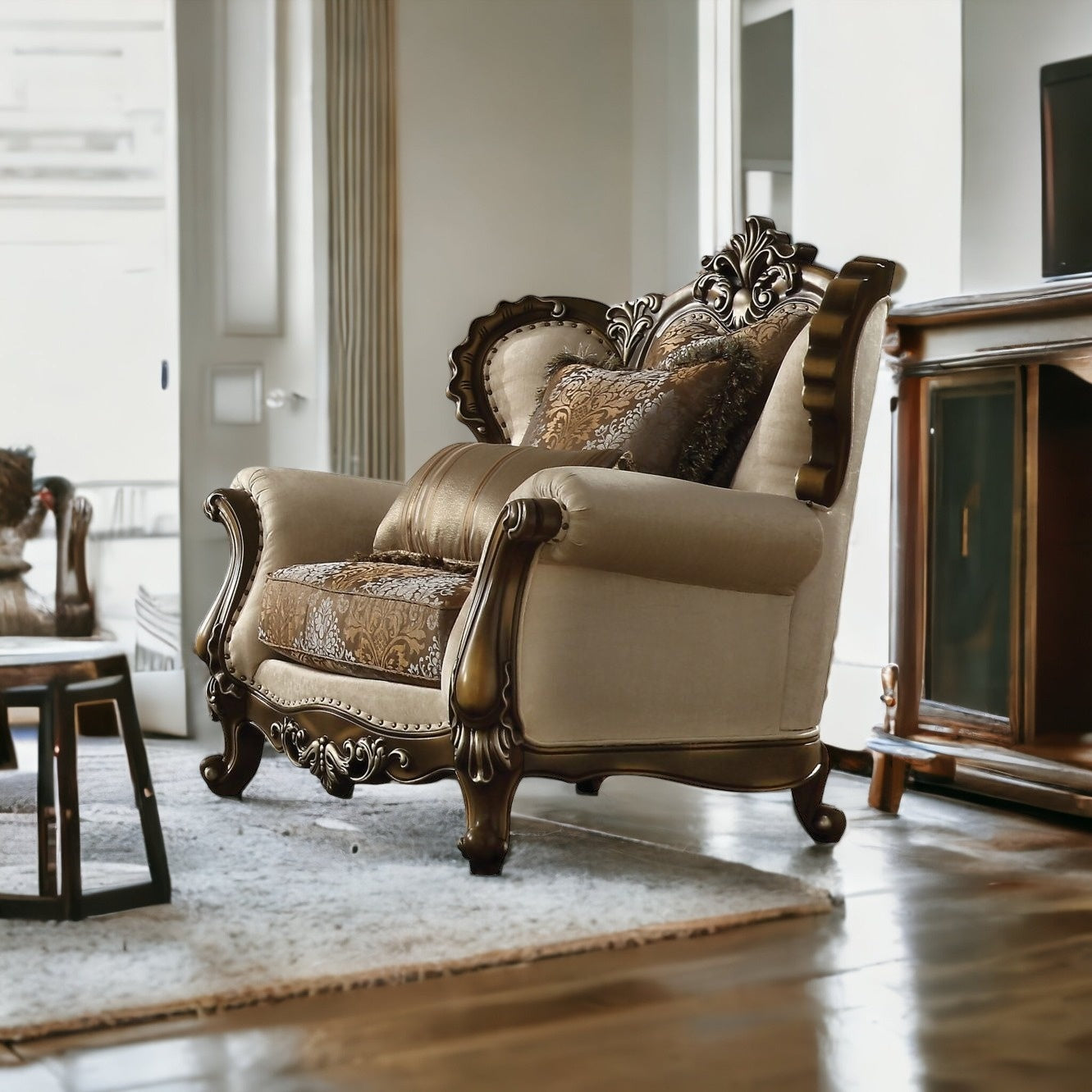 Fill your living room, bedroom, or office with fashionable seating options with this 49-inch tan and brown fabric floral tufted wingback chair. Built to last this wingback chair is upholstered in a beautiful tan floral patterned fabric to give your room a gorgeous and classic update. The high quality manufactured wood inner frame flaunts convenient armrests and a tight back that are complimented by soft and comfortable cushioning. The tufted cushions add fine designer detailing and are removable for convenience. Nailhead trim gives this chair a refined look that adds additional texture and visual interest. 2 decorative toss pillows are included to give the chair the perfect accent. 47-inch H x 49-inch W x 40-inch D
